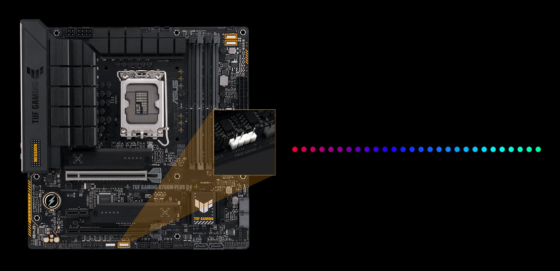 Seria Asus TUF Gaming B760M charakteryzuje się też oświetleniem RGB, które podkreśli złożoną konstrukcję PC. Podkreśl solidne wykonanie! Co więcej, możesz zsynchronizować oświetlenie ze sprzętem obsługującym technologię Aura!