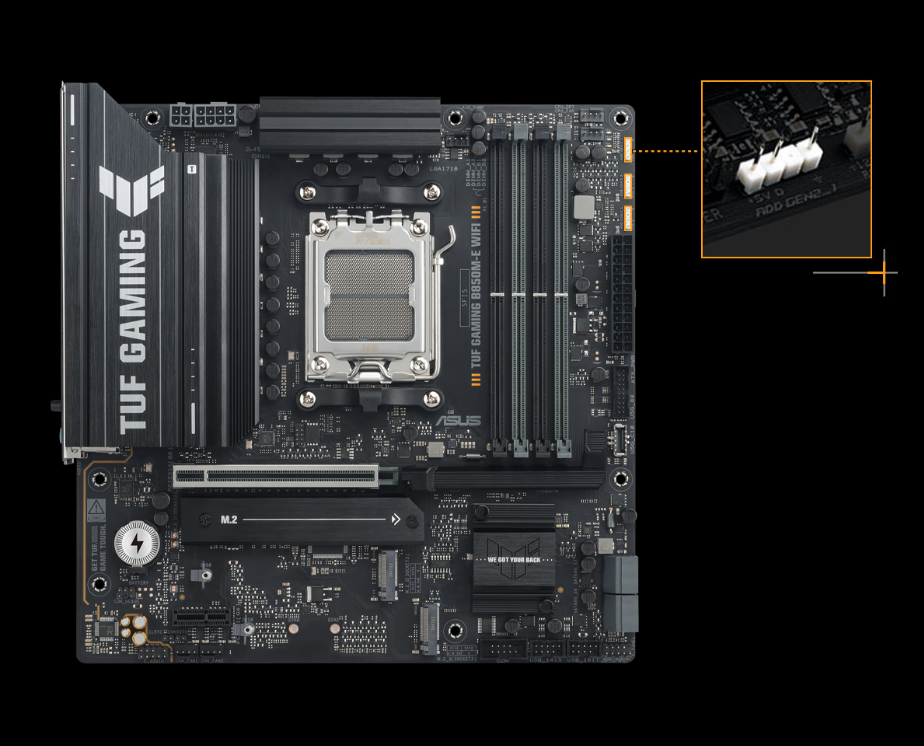 Dla tych, którzy preferują połączenia przewodowe, płyta główna ASUS TUF GAMING B850M-E WIFI oferuje port Realtek 2.5 Gigabit Ethernet. Ten port zapewnia przepustowość do 2,5 razy większą niż standardowe połączenia gigabitowe, co przekłada się na szybsze pobieranie plików i płynniejszą rozgrywkę sieciową. Stabilne i szybkie połączenie przewodowe to podstawa dla każdego entuzjasty e-sportu i profesjonalisty.