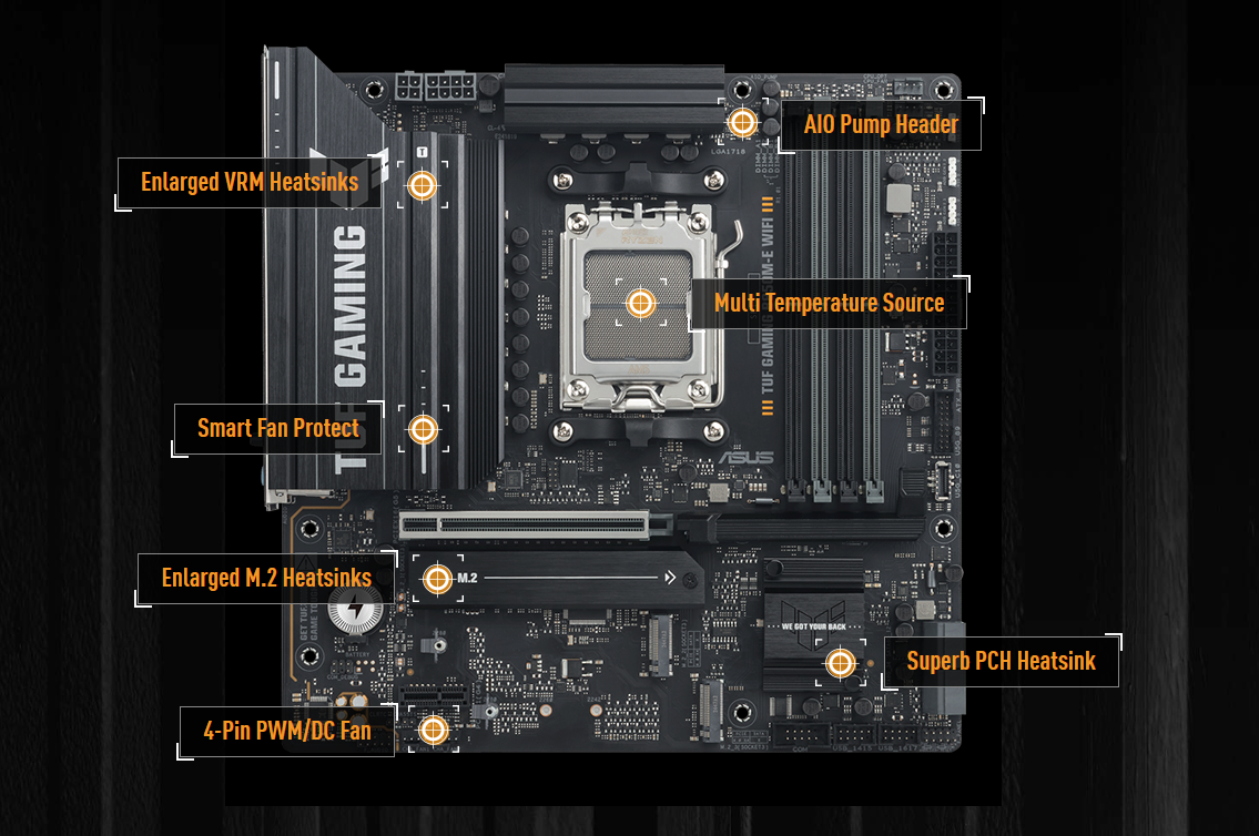 Odpowiednie chłodzenie jest kluczowe dla utrzymania optymalnej wydajności i stabilności systemu. Płyta główna ASUS TUF GAMING B850M-E WIFI posiada powiększone radiatory VRM oraz elastyczny radiator M.2, które skutecznie rozpraszają ciepło. Dodatkowo, technologia Fan Xpert 2+ umożliwia inteligentne sterowanie wentylatorami, dostosowując ich prędkość do aktualnych temperatur. Dzięki temu, komponenty pozostają chłodne nawet podczas intensywnego obciążenia, co zapobiega spadkom wydajności.
