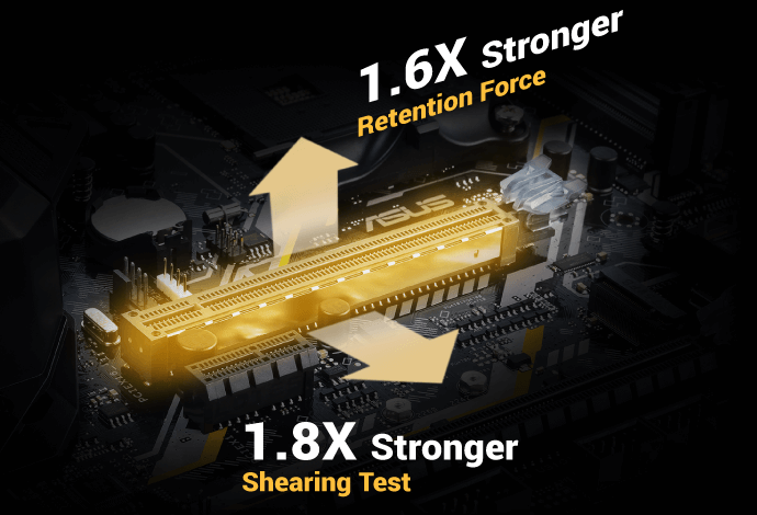SafeSlot to gniazdo PCIe opracowane na nowo przez firmę ASUS i zaprojektowane tak, aby zapewniało doskonałą odporność na przechowywanie i ścinanie. Wyprodukowany w nowym procesie formowania wkładek, SafeSlot łączy wzmacniający metal w celu uzyskania z natury mocniejszego gniazda, które jest następnie mocno zakotwiczone na płytce drukowanej za pomocą dodatkowych punktów lutowniczych.