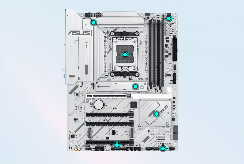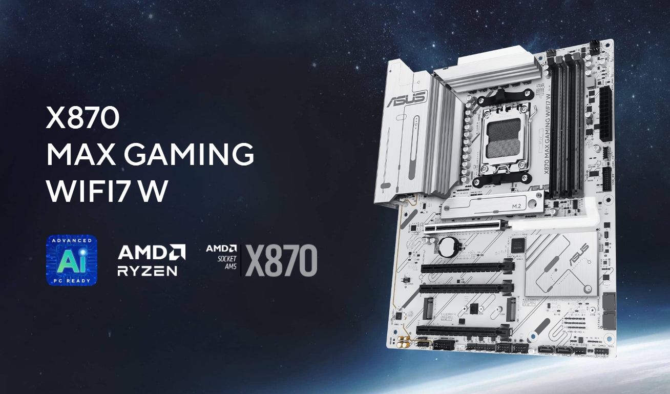 Płyty główne z serii ASUS X870 zostały zaprojektowane tak, aby w pełni wykorzystać potencjał procesorów AMD Ryzen™ serii 9000. Płyta główna X870 MAX GAMING WIFI7 W, charakteryzująca się solidnym projektem zasilania, kompleksowymi rozwiązaniami chłodzącymi i inteligentnymi opcjami strojenia, zapewnia użytkownikom oraz osobom samodzielnie składającym komputery szereg optymalizacji wydajnościowych poprzez intuicyjne oprogramowanie i funkcje oprogramowania układowego. Została stworzona z myślą o gotowości do zaawansowanych komputerów AI (Advanced AI PC-ready), oferując moc i łączność niezbędną do wymagających zastosowań AI.