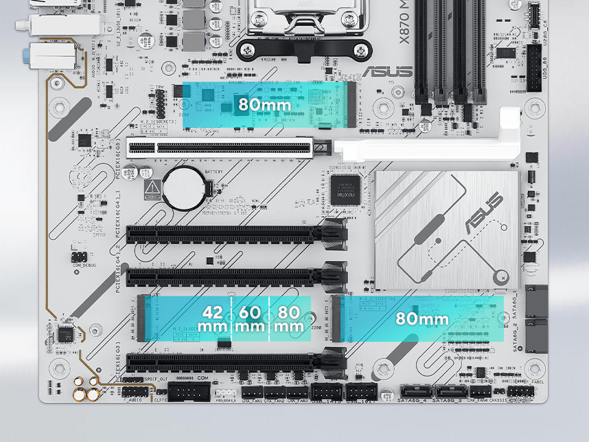 X870 MAX GAMING WIFI7 W oferuje łącznie trzy gniazda M.2, w tym jedno obsługujące prędkości transferu danych do 128 Gbps przez PCIe 5.0 oraz dwa obsługujące 64 Gbps przez PCIe 4.0. Pozwala to na szybsze uruchamianie systemu operacyjnego i aplikacji oraz krótszy czas ładowania.