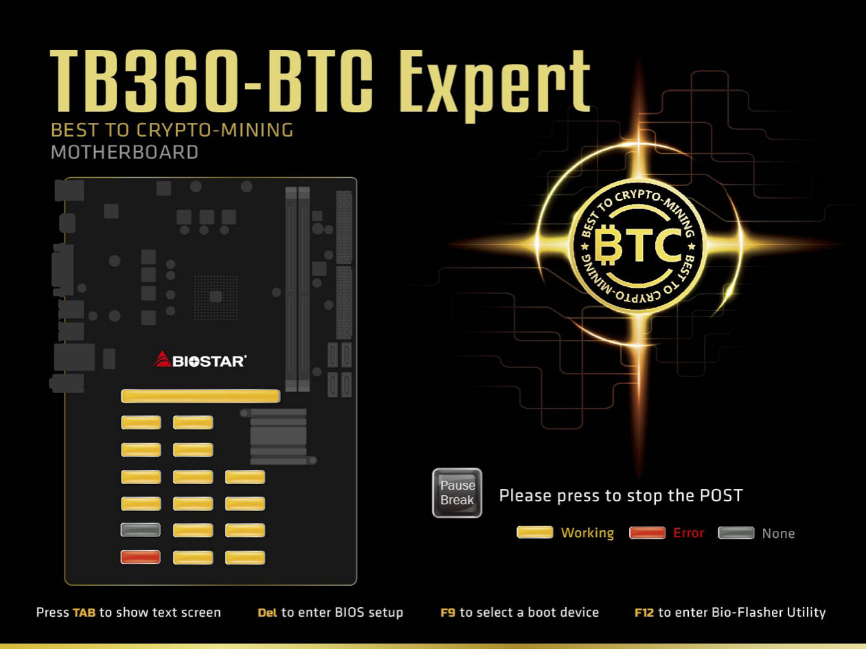 TB360-BTC Expert zawiera ekran startowy BIOS wykrywający gniazdo PCI-E. Unikalny BIOS dla płyt głównych serii BIOSTAR BTC, który może wykryć stan GPU na ekranie POST przed wejściem do systemu operacyjnego.