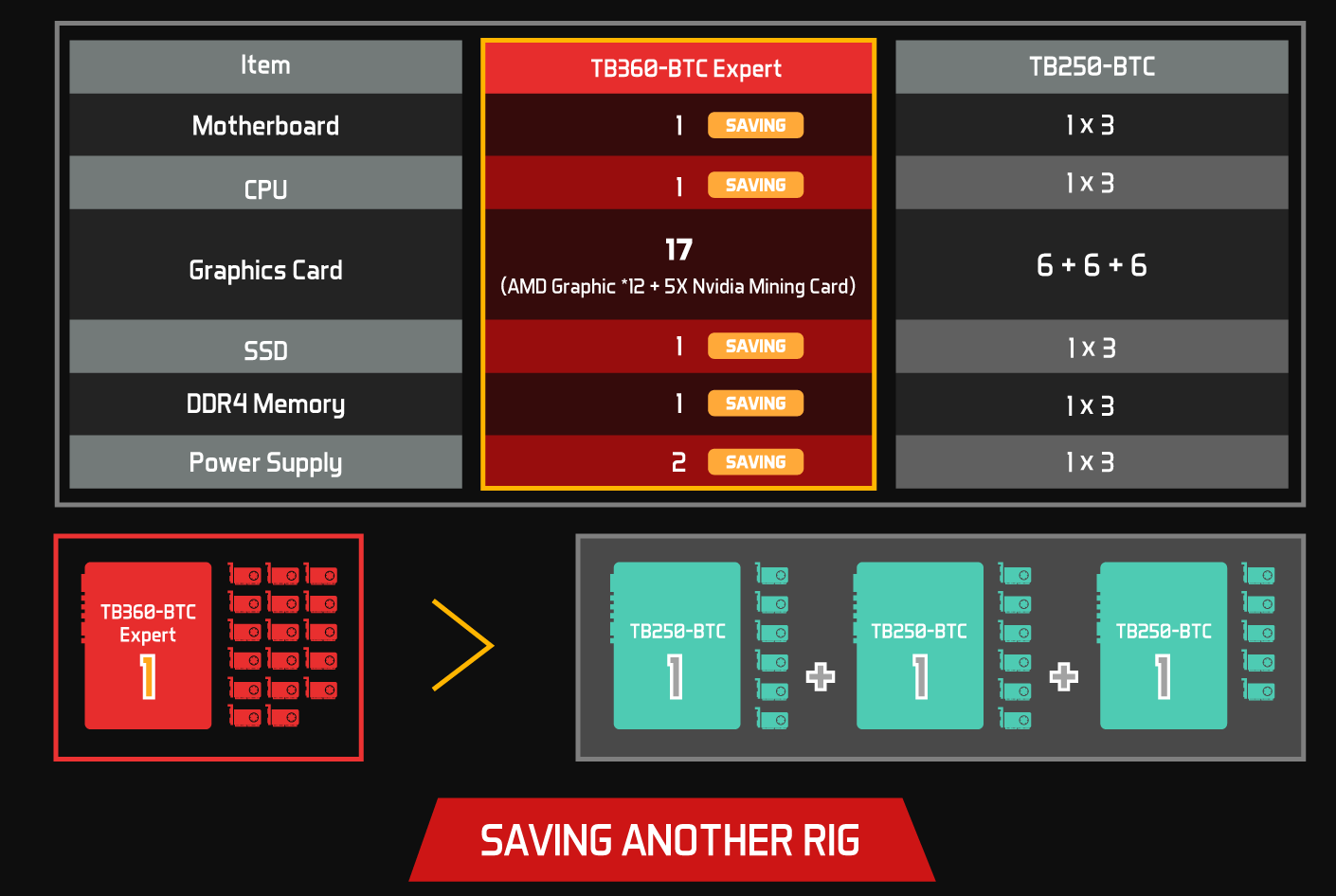 TB360-BTC Expert obsługuje do 17 kart graficznych, nie tylko oszczędzając więcej pieniędzy, ale także zwiększając wydajność. W porównaniu z płytą główną z 6 GPU, TB360-BTC Expert może pomóc Ci zaoszczędzić 2 zestawy procesorów, płyt głównych, dysków SSD, kart pamięci i innych urządzeń peryferyjnych PC. Naszym pierwotnym zamiarem jest nadal zapewnienie najlepszego rozwiązania oszczędzającego koszty.