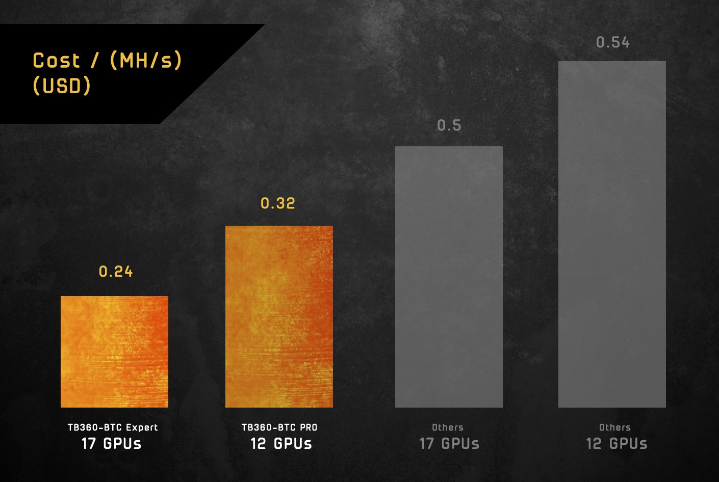 W porównaniu z trzema maszynami do kopania kryptowalut z TB250-BTC, jedno urządzenie z płytą TB360-BTC Expert skutecznie zwiększa wydajność kopania kryptowalut, aby zmaksymalizować rentowność i uzyskać najniższy koszt hashrate na MHz.