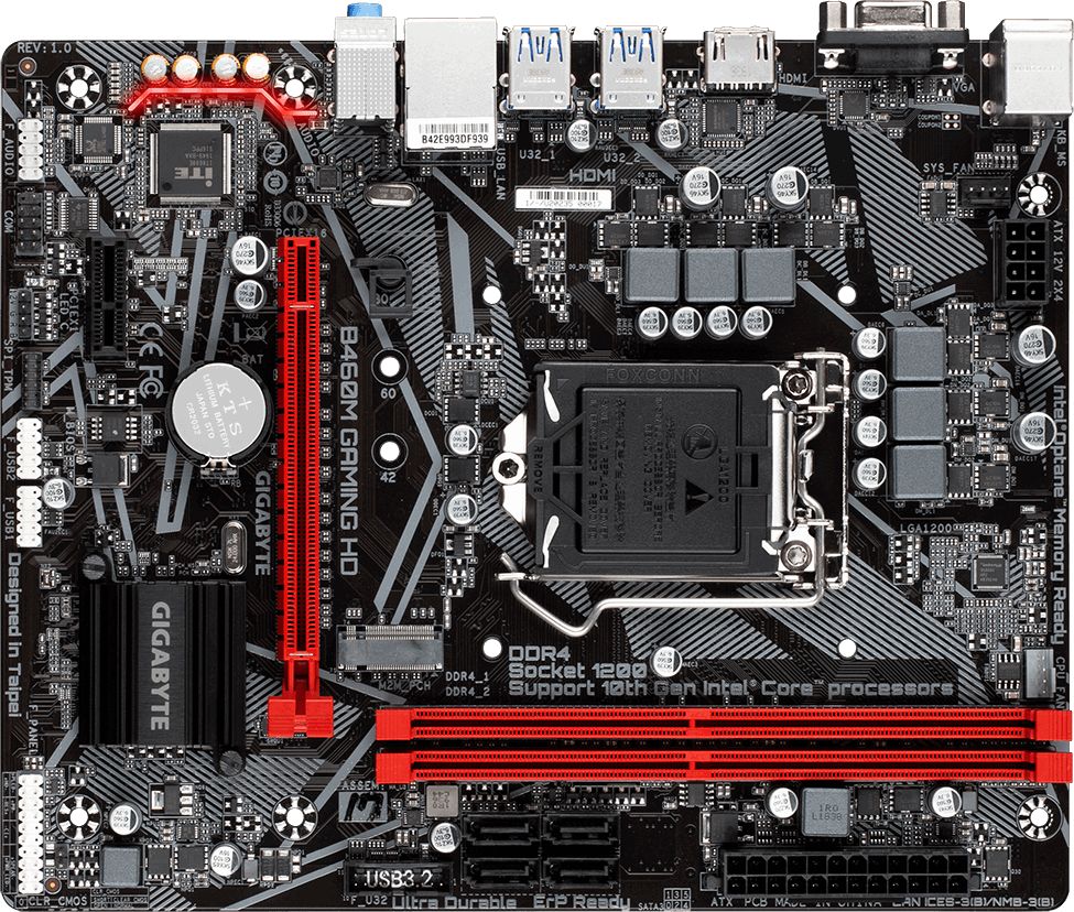 Płyta główna Gigabyte B460M GAMING HD to niewielka i wydajna platforma zbudowana w standardzie Micro ATX. Możesz na niej zbudować dobry komputer do domu lub biura, który poradzi sobie także z grami. W samym centrum znajdziesz socket 1200, współpracujący z procesorami Intel: od Celerona po wielordzeniowe Core i3, i5, i7 i9. Mając zaś na pokładzie chipset Intel B460, zyskujesz pewność dobrej komunikacji wszystkich podzespołów oraz doskonałego przepływu danych między poszczególnymi elementami.
