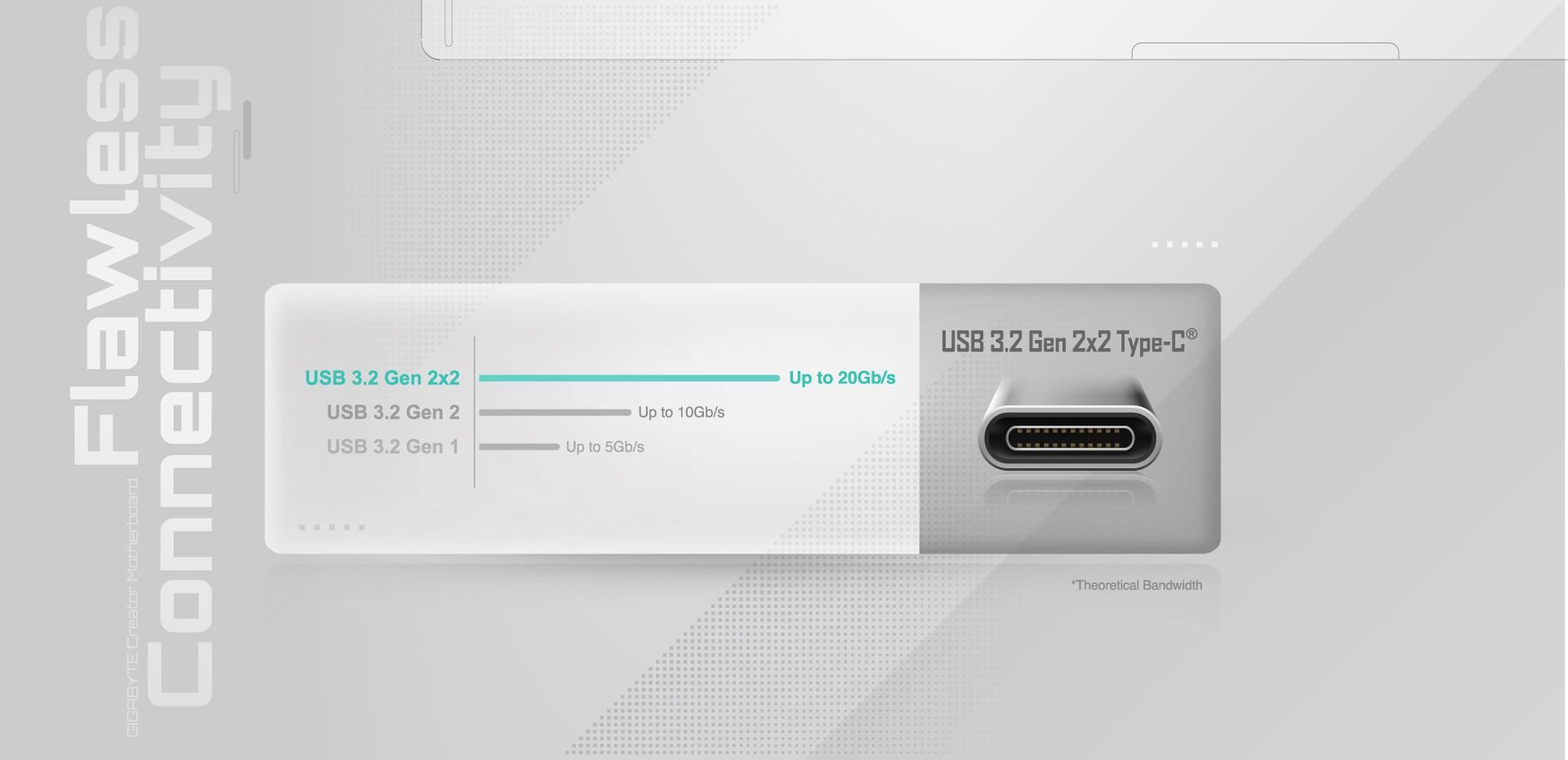 Aby zapewnić łączność USB 3.2 Gen 2x2, która jest dwukrotnie wydajniejsza niż obecne USB 3.2 Gen 2. Działa z ultraszybkim transferem danych do 20 Gb/s przy podłączeniu do urządzeń peryferyjnych zgodnych z USB 3.2. Możesz cieszyć się najwyższą elastycznością połączenia, aby szybko uzyskiwać dostęp do ogromnych ilości danych.