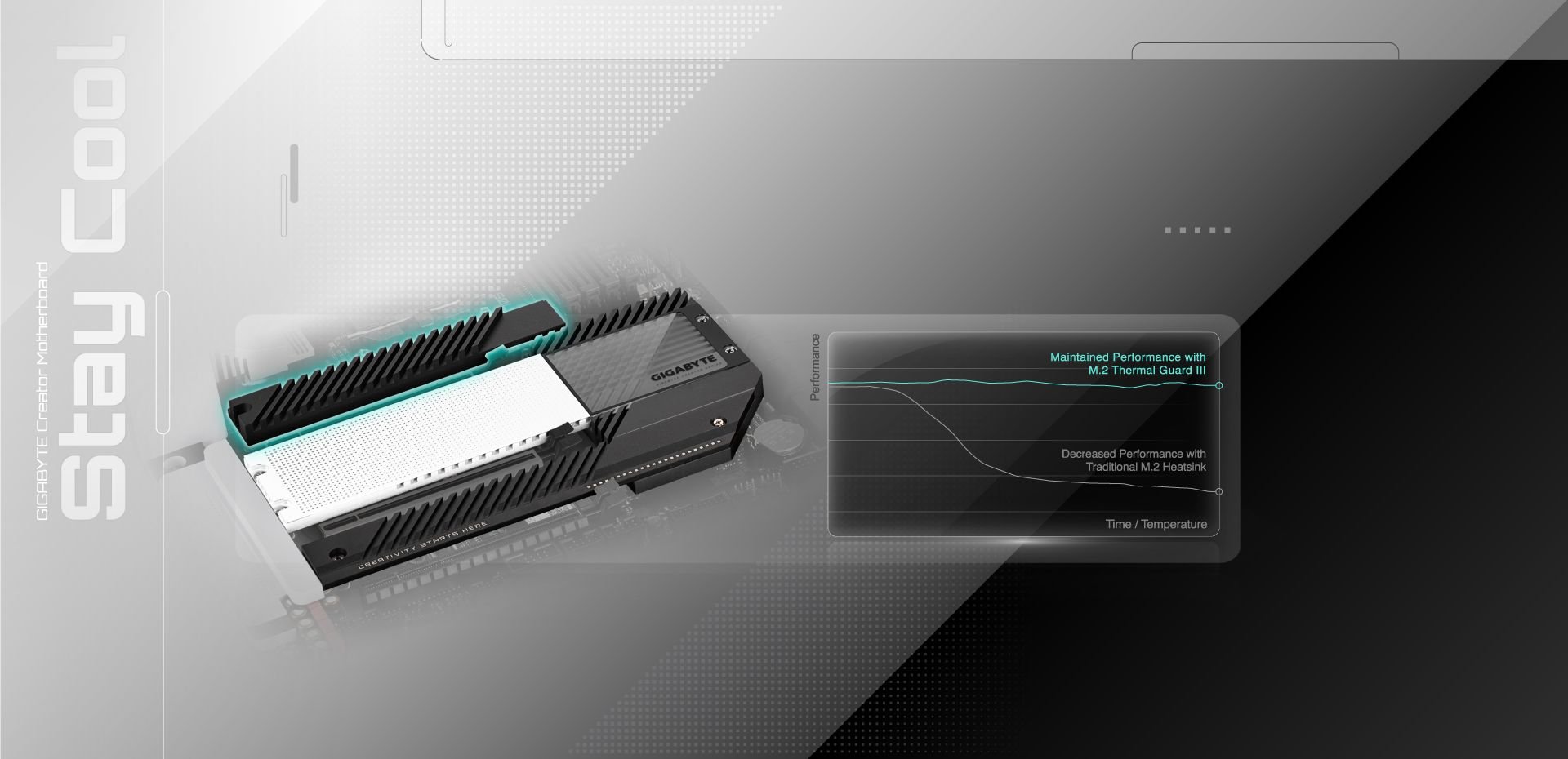 Nowa konstrukcja GIGABYTE M.2 Thermal Guard III podnosi wysokość radiatora M.2, aby obniżyć temperaturę dla wysokich prędkości transferu dysków SSD M.2 i rozproszyć ciepło, zanim stanie się ono problemem.