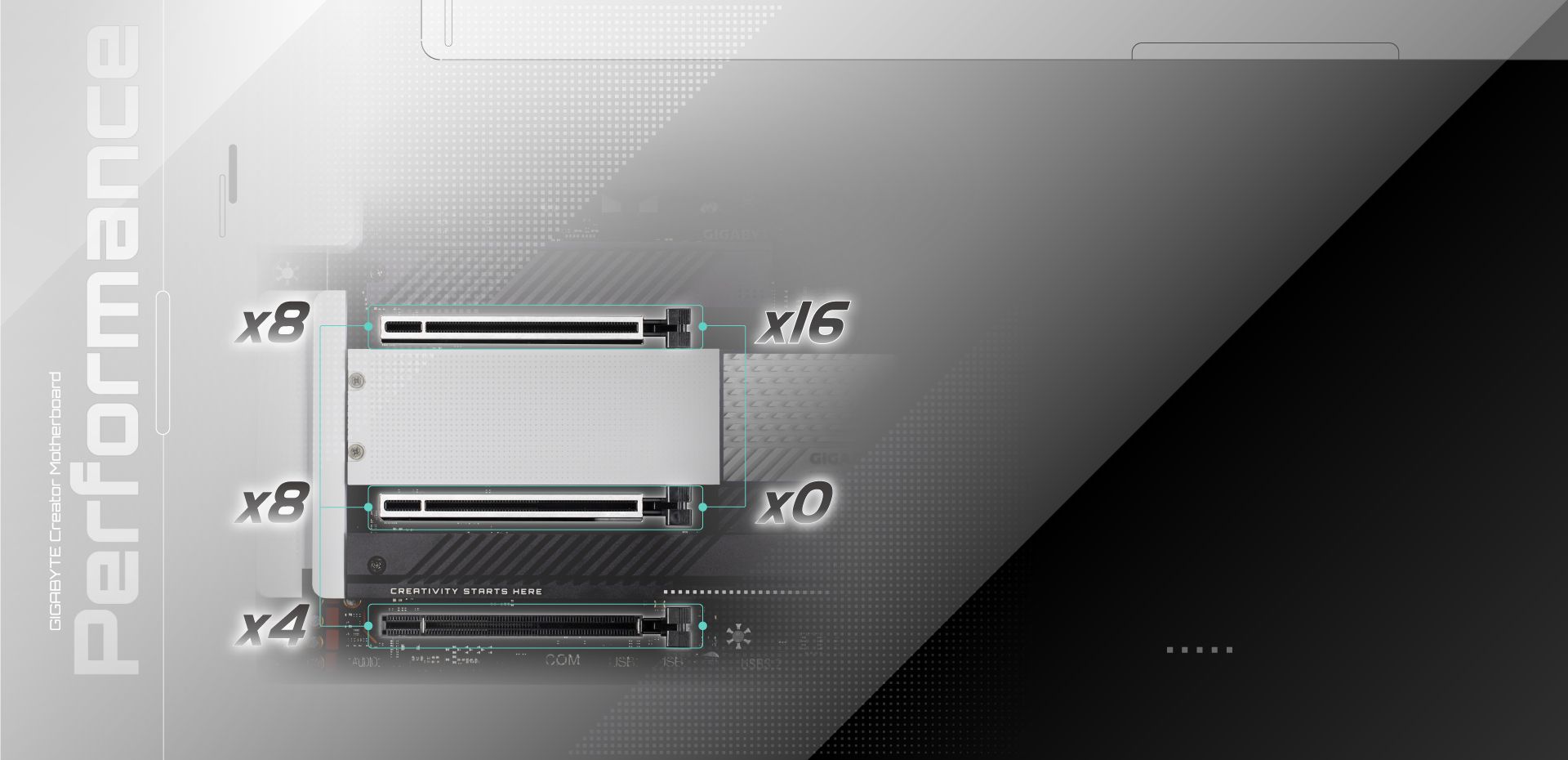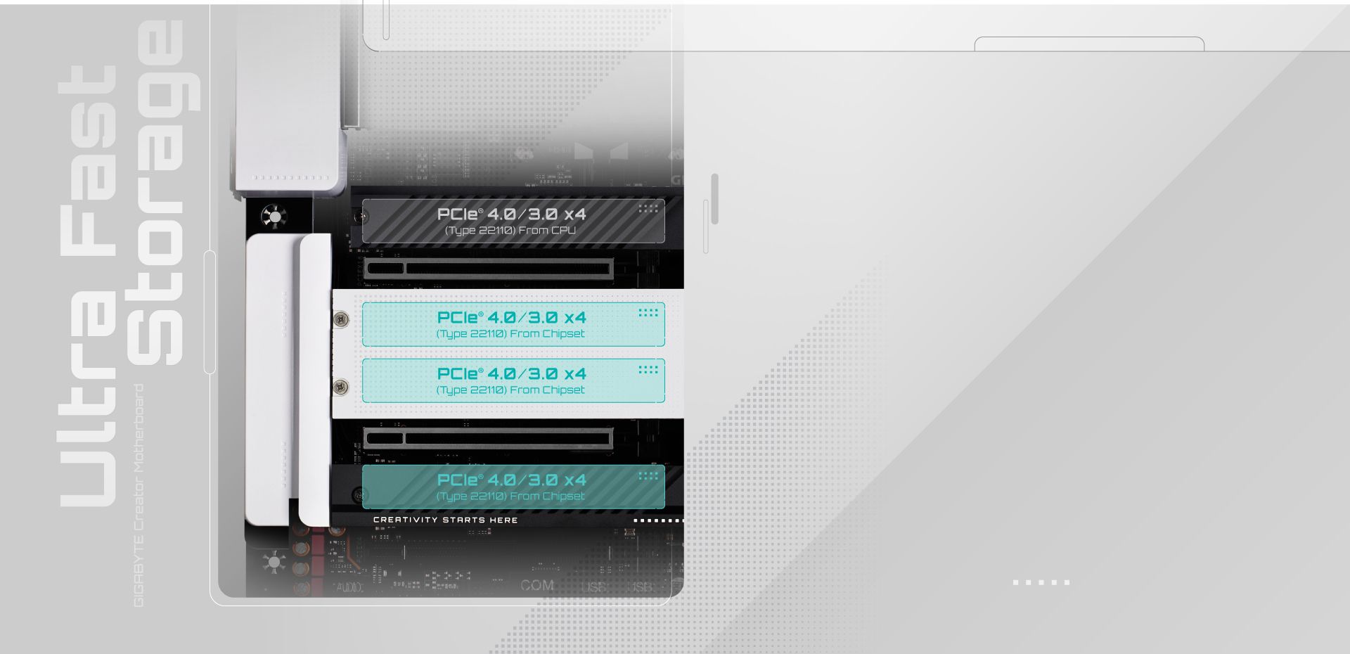 Cztery gniazda PCIe® M.2 zapewniają doskonałą przepustowość i zwiększają pojemność pamięci masowej w celu przyspieszenia kreatywnego przepływu pracy. Dysk SSD M.2 PCIe® zapewnia 7-krotnie szybsze przesyłanie danych w porównaniu z 2,5-calowymi dyskami SSD SATA.