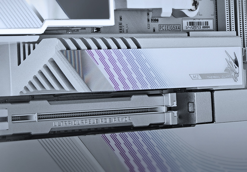 Aby utrzymać optymalną wydajność ultraszybkich dysków SSD M.2, płyta X870E AORUS MASTER X3D ICE została wyposażona w zaawansowany system chłodzenia. Obejmuje on pięć slotów M.2 z dedykowanymi, dużymi radiatorami M.2 Thermal Guard oraz rozwiązaniem M.2 EZ-Flex z opatentowaną elastyczną płytą bazową i Thermal Guard Ext na najważniejszych slotach. Te masywne radiatory, w połączeniu z płytką drukowaną z podwójną ilością miedzi, zapewniają wydajne odprowadzanie ciepła, zapobiegając termicznemu dławieniu (throttlingowi) i utrzymując maksymalną prędkość transferu danych.