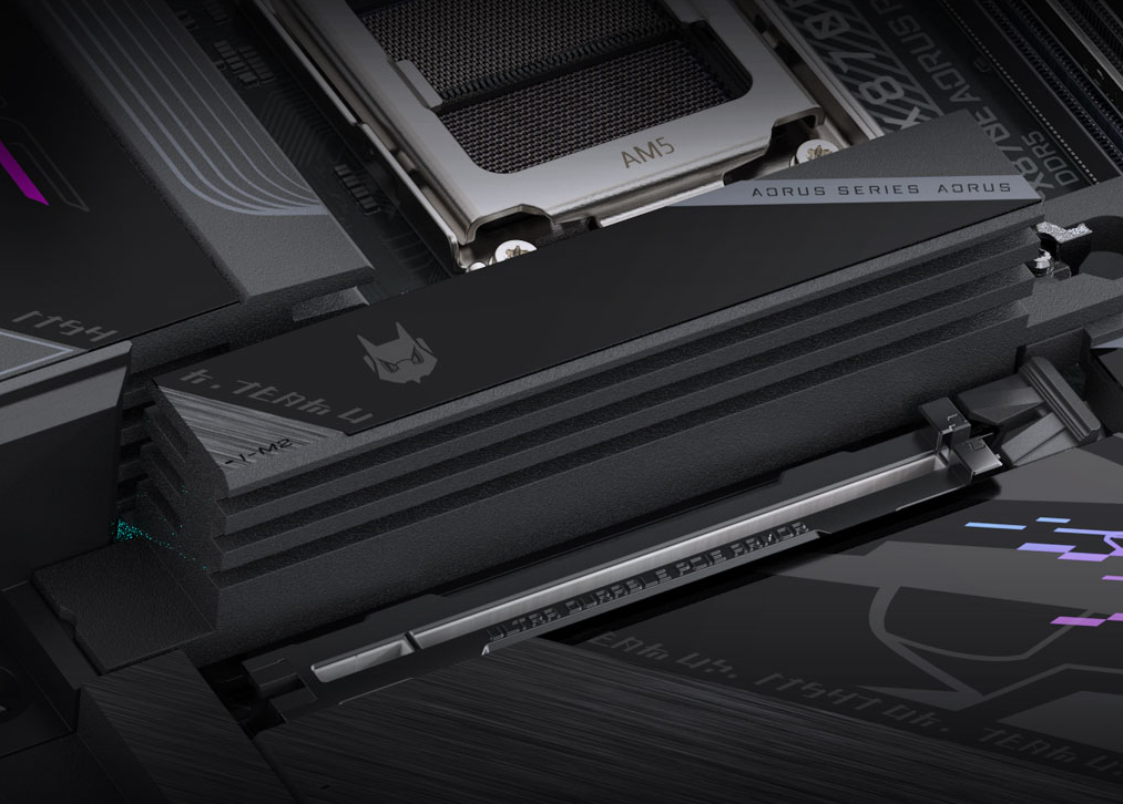 Model X870E AORUS PRO X3D jest w pełni gotowy na przyszłość, oferując interfejs PCI Express 5.0 zarówno dla kart graficznych, jak i dysków SSD. Posiada gniazdo PCIe 5.0 x16 ze specjalnym wzmocnieniem PCIe UD Slot X, które zwiększa wytrzymałość gniazda na ciężkie karty graficzne. Dodatkowo, na płycie znajdują się aż cztery złącza M.2 Socket 3, w tym dwa ultraszybkie M.2 z obsługą standardu PCIe 5.0 x4 i dwa PCIe 4.0 x4. Umożliwia to budowę ekstremalnie szybkich systemów pamięci masowej, skracając czasy ładowania gier i aplikacji do minimum.