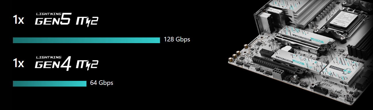 Doświadcz rewolucyjnej prędkości transferu danych dzięki złączu Lightning Gen 5 M.2, które oferuje przepustowość do 128 Gb/s. Jest to idealne rozwiązanie dla najnowszych dysków SSD NVMe, pozwalające na natychmiastowe ładowanie gier, systemu operacyjnego i aplikacji. Płyta główna jest również wyposażona w dodatkowe złącze M.2 Gen4, co daje elastyczność w konfiguracji przestrzeni dyskowej. Twoje gry i programy uruchomią się szybciej niż kiedykolwiek wcześniej.