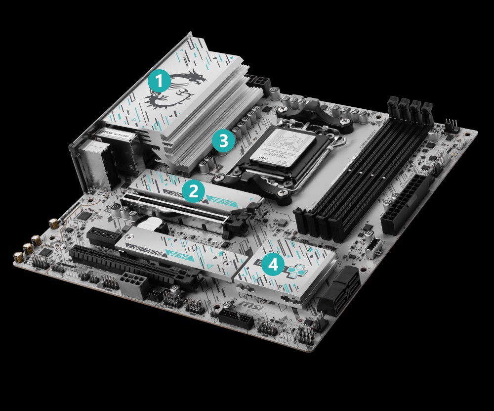 Stabilność i wydajność nawet pod największym obciążeniem zapewnia zaawansowana, cyfrowa sekcja zasilania 8+2+1 Power System. W połączeniu z technologią Core Boost i dwoma 8-pinowymi złączami zasilania procesora, płyta jest w stanie dostarczyć precyzyjny i niezakłócony prąd do najbardziej wymagających komponentów. To gwarancja płynnej rozgrywki i stabilnej pracy podczas wielogodzinnych sesji gamingowych oraz renderowania grafiki. Niezależnie od tego, jak intensywnie korzystasz z komputera, sekcja zasilania MSI sprosta każdemu wyzwaniu.
