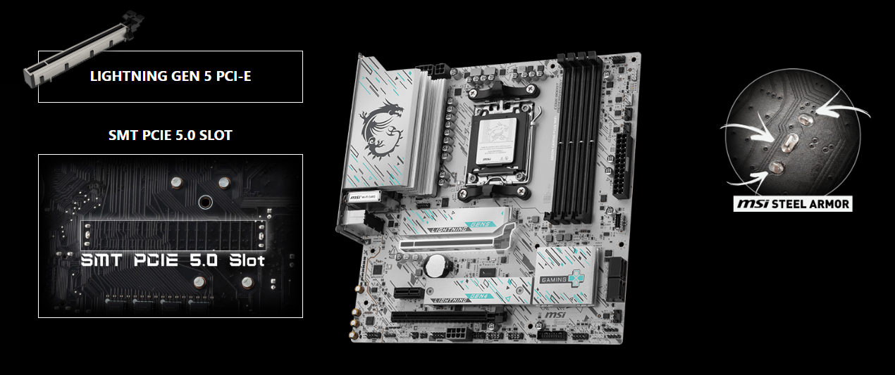 Przepustowość interfejsu x16 może osiągnąć 128 GB/s, podwajając tym samym wydajność w porównaniu do poprzedniej generacji. Zaawansowane gniazdo PCIE, wykorzystujące technologię montażu powierzchniowego (SMT - Surface Mount Technology), redukuje zakłócenia i szumy elektryczne, w pełni wspierając sygnał PCI-E 5.0. Jest ono mocowane do płyty głównej za pomocą dodatkowych punktów lutowniczych, co zapewnia stabilność i pozwala utrzymać ciężar dużych kart graficznych.
