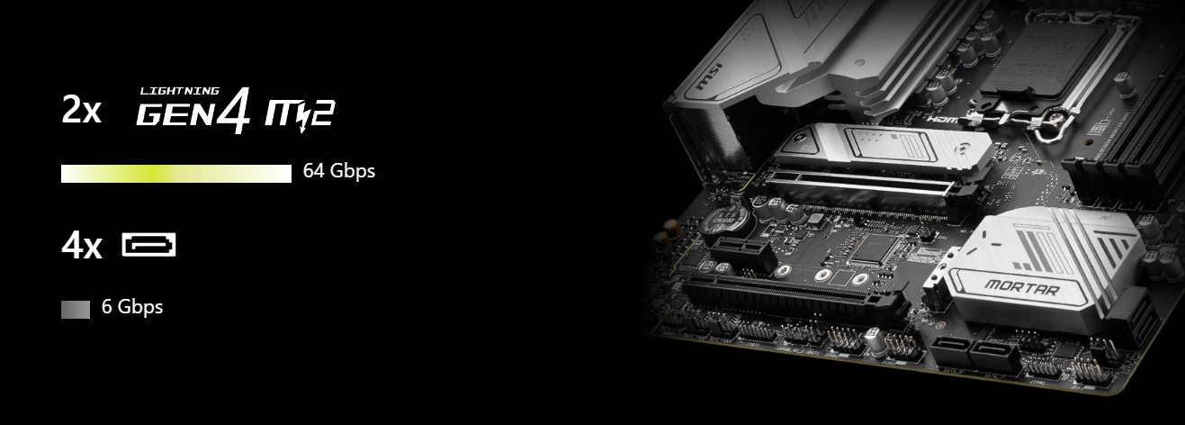 Płyty główne z serii MSI MAG obsługują wszystkie najnowsze standardy pamięci masowej, co pozwala użytkownikom na podłączenie dowolnego ultraszybkiego urządzenia pamięci masowej. Szybciej rozpoczynaj gry, szybciej wczytuj poziomy i uzyskaj realną przewagę nad wrogami.