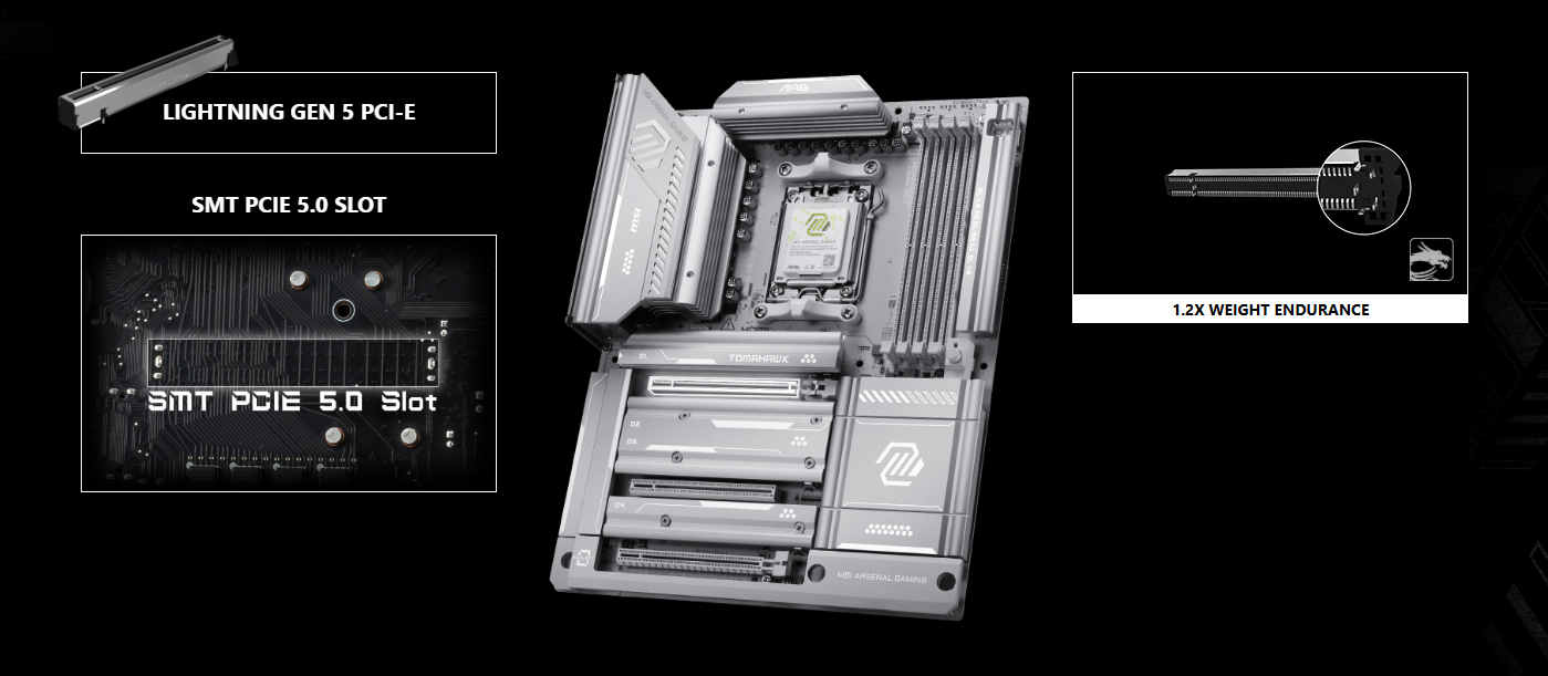 Płyta posiada wzmocnione gniazdo PCI Express 5.0, które jest gotowe na obsługę najpotężniejszych kart graficznych dostępnych na rynku i tych, które dopiero nadejdą. Standard PCIe 5.0 oferuje znacznie większą przepustowość niż 4.0, co minimalizuje ryzyko "wąskiego gardła" i pozwala karcie graficznej działać z maksymalną wydajnością. Wzmocniona konstrukcja (Steel Armor) chroni slot przed uszkodzeniem mechanicznym, nawet w przypadku montażu bardzo ciężkich kart graficznych. To kluczowy element dla każdego gracza dążącego do najwyższej jakości wizualnej.