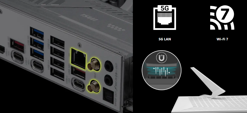 Dla zapewnienia płynnego i niezakłóconego doświadczenia online, płyta wyposażona jest w kontroler sieciowy 5G LAN, który gwarantuje ultraszybkie połączenia przewodowe, minimalizując opóźnienia w grach i przyspieszając transfery danych. Ponadto, MAG X870E TOMAHAWK MAX WIFI PZ oferuje najnowocześniejszy standard komunikacji bezprzewodowej Wi-Fi 7. Technologia ta zapewnia niesamowicie wysokie prędkości, znacznie niższe opóźnienia i lepszą stabilność połączenia dla użytkowników ceniących wolność od kabli. Moduł bezprzewodowy integruje również najnowszą generację Bluetooth, co ułatwia podłączanie peryferyjnych urządzeń.