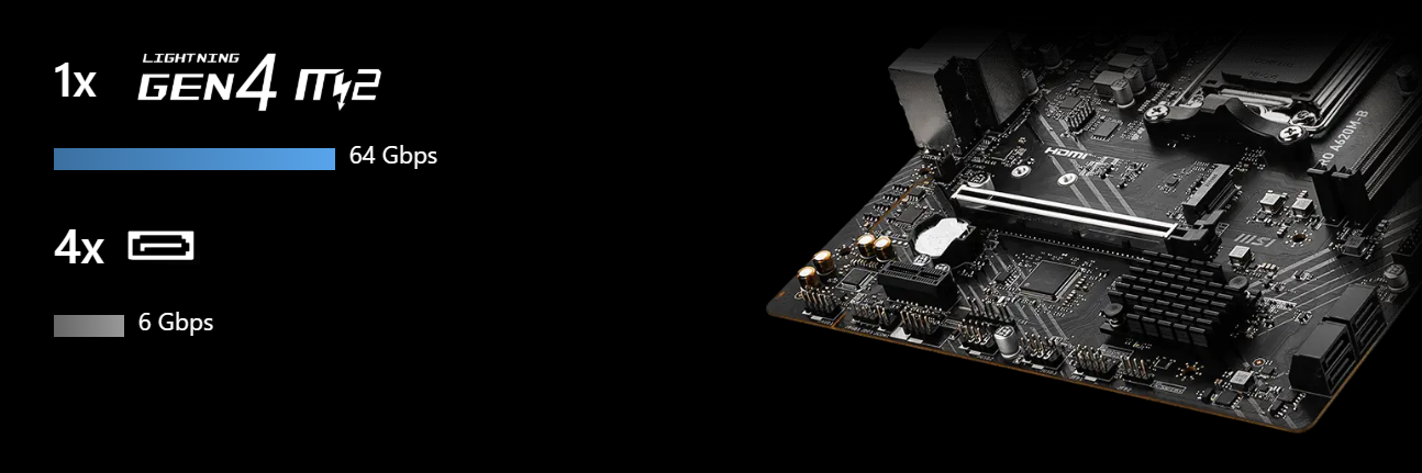 Płyty główne z serii MSI PRO obsługują wszystkie najnowsze standardy pamięci masowej, co pozwala użytkownikom na podłączenie dowolnego ultraszybkiego urządzenia pamięci masowej. Szybciej rozpoczynaj gry, szybciej wczytuj poziomy i uzyskaj realną przewagę nad wrogami.