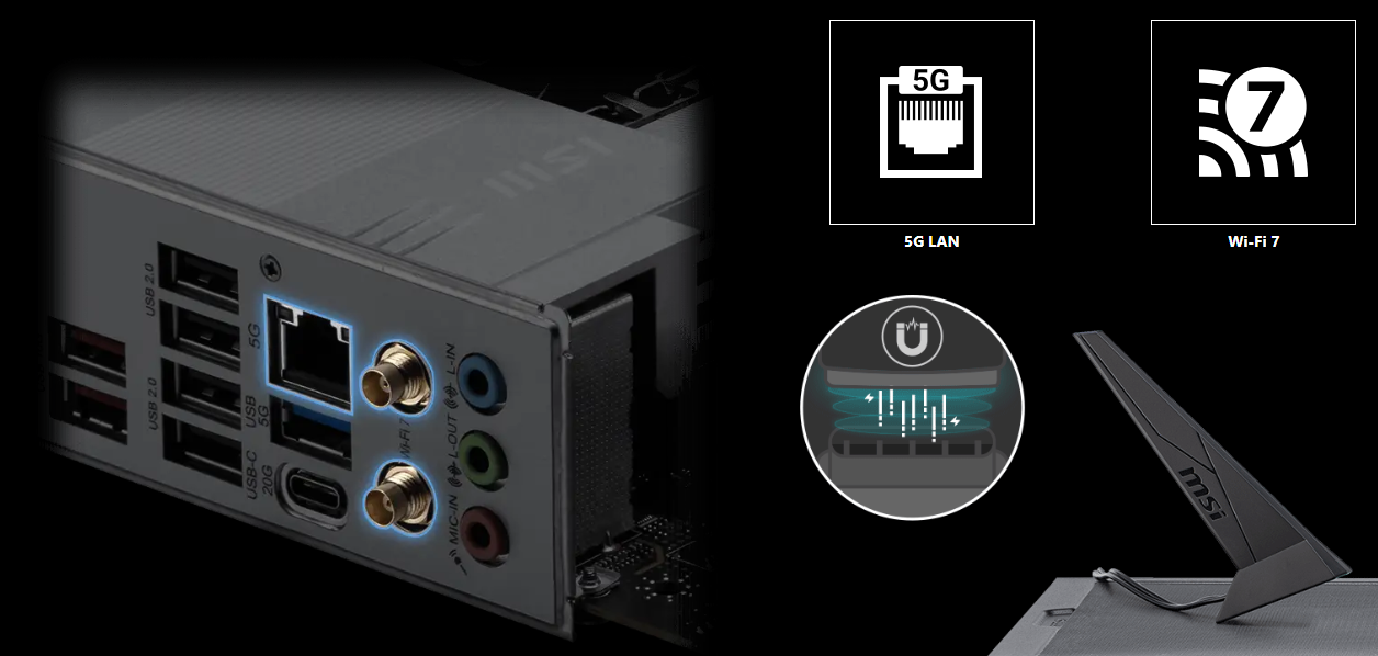 Płyta główna oferuje najnowocześniejsze rozwiązania w zakresie łączności sieciowej, gwarantując ultraszybki i stabilny dostęp do Internetu. Zintegrowany moduł Wi-Fi 7 (802.11be) z technologią EZ Antenna zapewnia maksymalną prędkość transmisji danych do 5,8 Gbit/s, co jest ponad dwukrotnie szybsze niż w poprzednich standardach. Dodatkowo, przewodowa karta sieciowa Realtek® 5G LAN pozwala na osiągnięcie przepustowości 5000 Mb/s, idealnej do przesyłania dużych plików i grania w chmurze bez opóźnień. Dzięki temu użytkownik otrzymuje bezpieczne, stabilne i superszybkie połączenia, niezbędne w profesjonalnych zastosowaniach.
