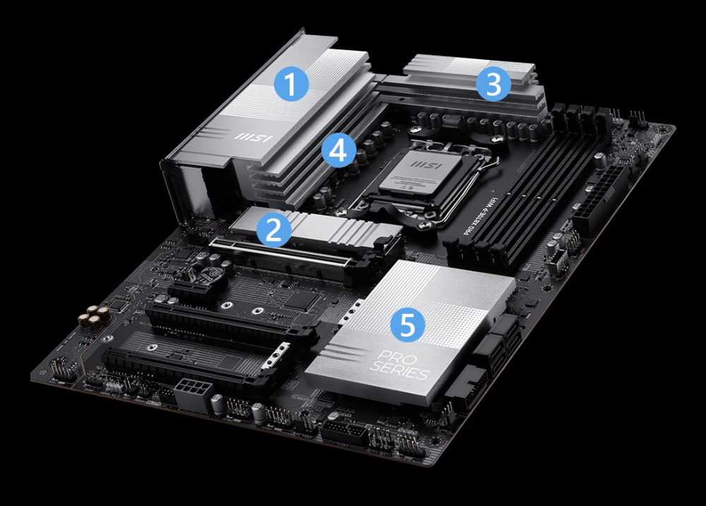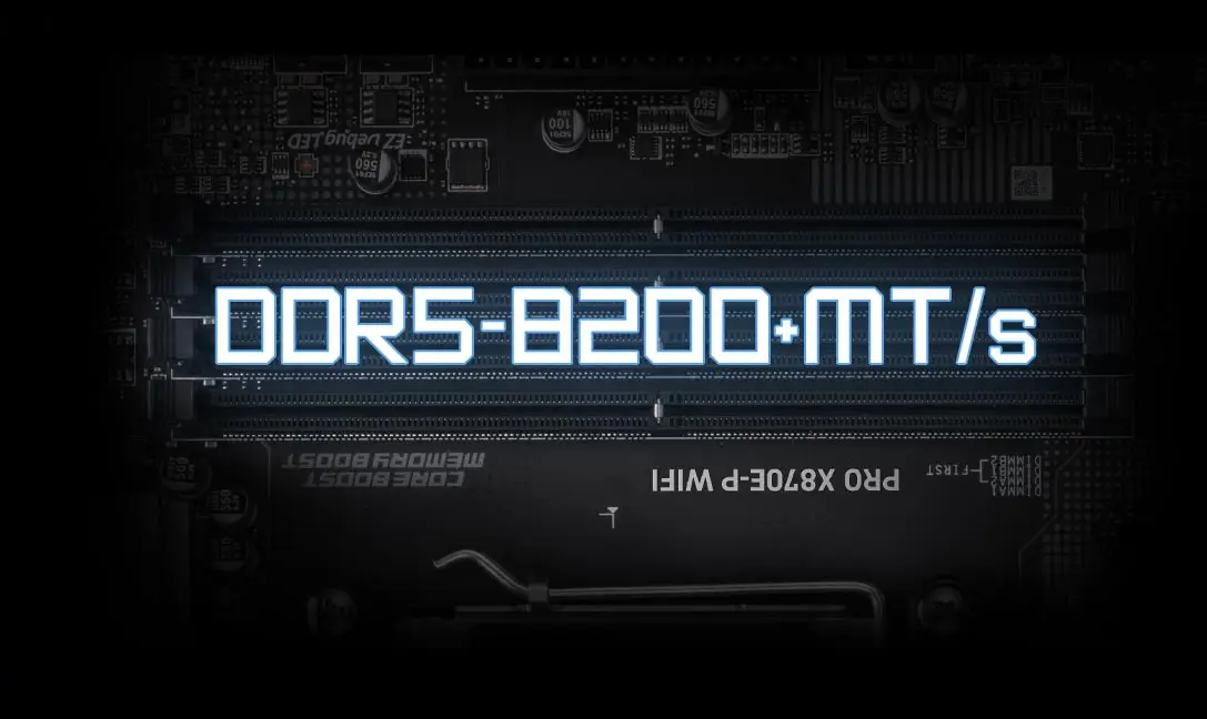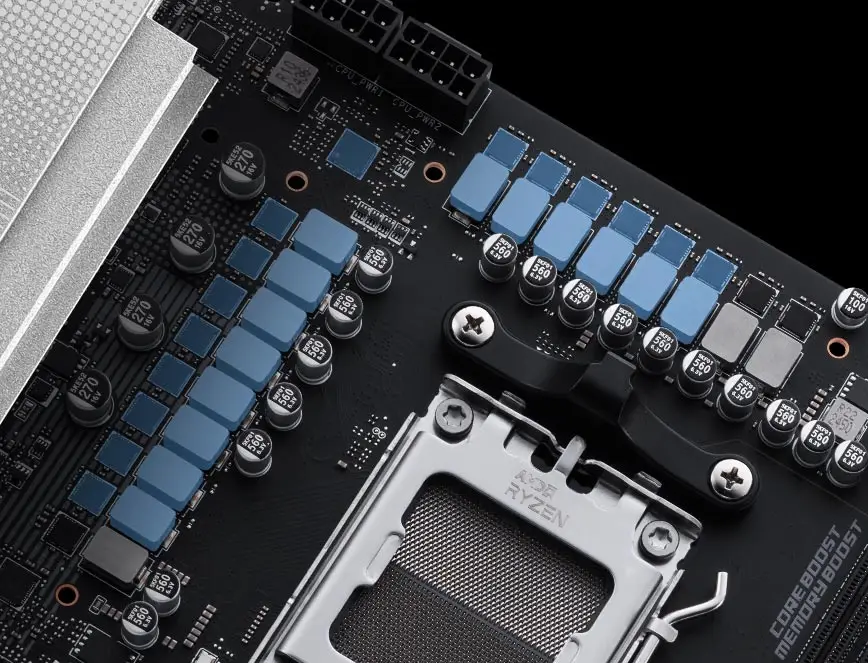 Płyta główna PRO X870E-P WIFI została wyposażona w 14+2+1-fazowy system zasilania Duet Rail Power System (DRPS). Taka architektura VRM (Voltage Regulator Module) zapewnia wyjątkową stabilność napięcia i efektywne dostarczanie energii do procesora. W połączeniu z podwójnymi 8-pinowymi złączami zasilania CPU oraz komponentami klasy serwerowej, płyta jest w stanie utrzymać maksymalną wydajność nawet podczas ekstremalnego overclockingu. Dzięki temu użytkownik może w pełni uwolnić potencjał procesorów AMD Ryzen wysokiej klasy, nie martwiąc się o spadki wydajności.