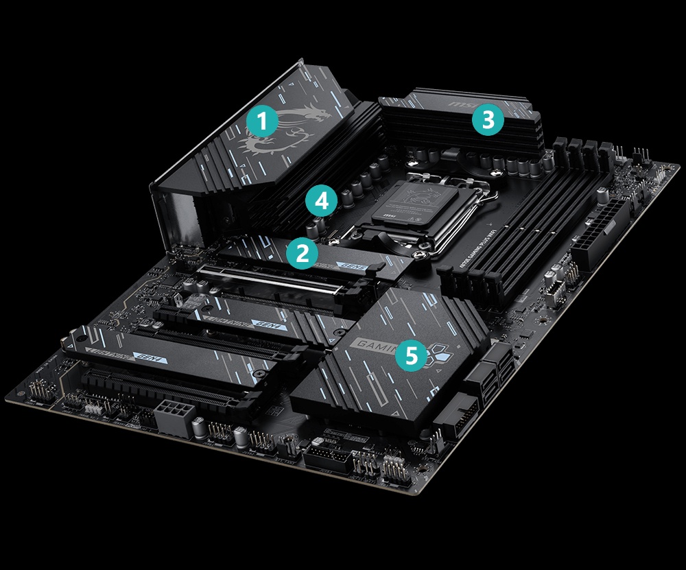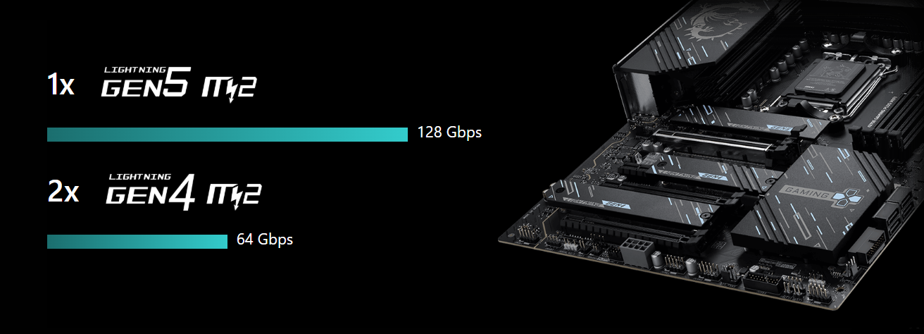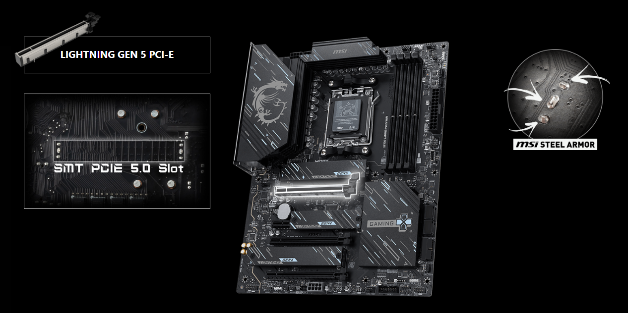 Podwajając przepustowość w porównaniu do poprzedniej generacji, interfejs x16 może osiągnąć 128 GB/s. Zaawansowane gniazdo PCI-E z technologią SMT (Surface Mount Technology) zmniejsza zakłócenia i szumy elektryczne, w pełni wspierając sygnał PCI-E 5.0. Gniazda MSI PCI Express Steel Armor są dodatkowo zabezpieczone na płycie głównej za pomocą dodatkowych punktów lutowniczych i wspierają ciężkie karty graficzne. Gdy każda przewaga w grach ma znaczenie, Steel Armor chroni punkt styku przed zakłóceniami elektromagnetycznymi.