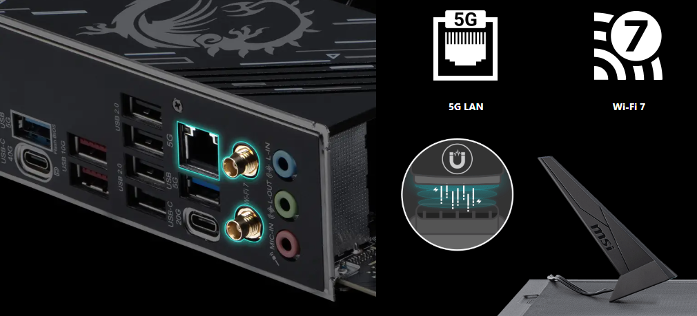 MSI X870E Gaming Plus WIFI w pełni wykorzystuje potencjał najnowszych standardów łączności. Płyta jest wyposażona w moduł Wi-Fi 7, zapewniający ultraszybkie i stabilne połączenia bezprzewodowe z prędkością do 5,8 Gb/s. Dodatkowo, wbudowany kontroler sieci LAN Realtek 5G zapewnia niezawodne połączenia przewodowe, a obsługa Bluetooth 5.4 umożliwia bezproblemowe łączenie z innymi urządzeniami.