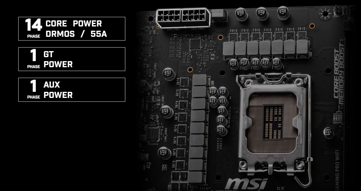 Uwolnij i utrzymuj maksymalną wydajność dzięki konstrukcji VRM zbudowanej w oparciu o konstrukcję zasilania 14+1+1. Łącząc podwójne złącza zasilania i ekskluzywną technologię Core Boost, Z790 GAMING PRO WIFI jest gotowy na wyzwania stawiane przez wysokiej klasy procesory.