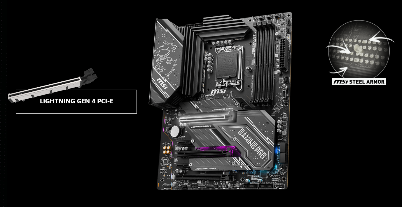 Dwukrotnie większa w porównaniu z poprzednią generacją, przepustowość interfejsu x16 może osiągnąć 64 GB/s. Przymocuj do płyty głównej za pomocą dodatkowych punktów lutowniczych i utrzymuj ciężar ciężkich kart graficznych.