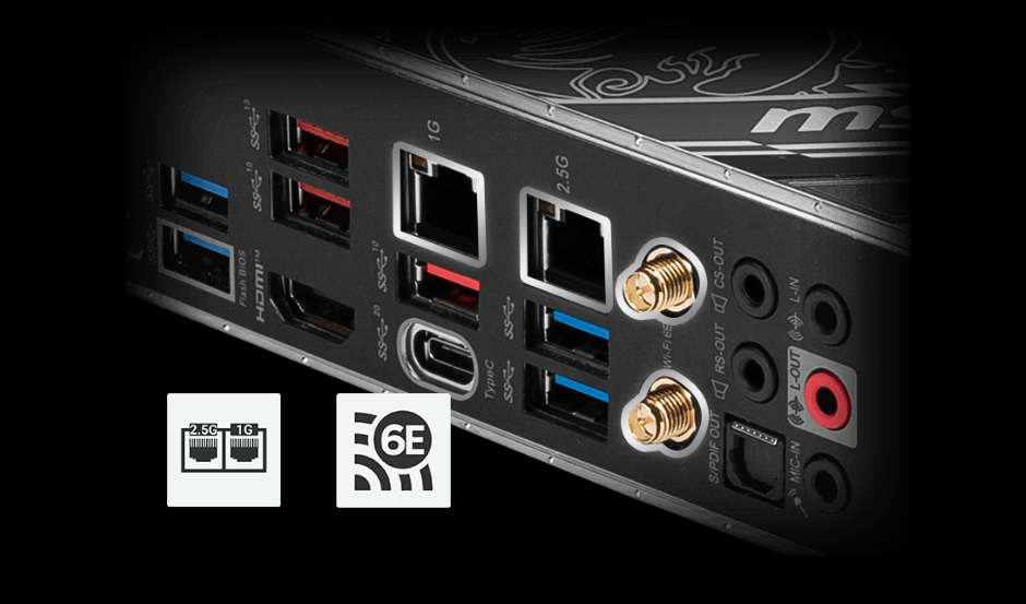 Najnowszy, bezprzewodowy moduł sieciowy zgodny ze standardem Wi-Fi 6E pozwala na pracę na częstotliwość 6 GHz, obsługuje Bluetooth 5.2, dwukierunkowe MU-MIMO i BSS Color Technology (Basic Service Set Color), dzięki czemu zapewnia do 4x większą przepustowość i wydajność sieci w środowisku o dużym zagęszczeniu sygnału. To dlatego, prędkość transmisji może dochodzić do 2400 Mbit/s.