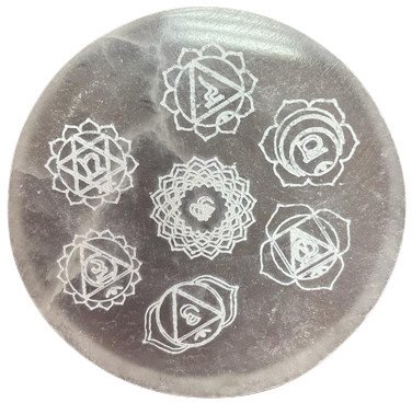 Płytka Selenitowa Mała – Czakra cz-b. Wymiary 8 x 2 cm. Okrągła płytka selenitowa to piękna i funkcjonalna ozdoba, wykonana ręcznie z kamienia selenitu. Na jej powierzchni znajdują się wygrawerowane symbole czakr – punktów energii w ciele człowieka. Symbolika czakramów jest bardzo ważna w hinduizmie, buddyzmie i innych praktykach duchowych. Każdy z siedmiu czakramów odpowiada za określone obszary życia i ciała. Może być wykorzystana jako praktyczne narzędzie podczas medytacji i praktyk duchowych, lub jako piękna ozdoba do każdego wnętrza. Idealny produkt dla osób zainteresowanych praktykami duchowymi i rozwojem osobistym, a jednocześnie ceniących sobie piękno i estetykę.