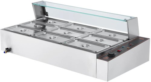 Podgrzewacz doskonale sprawdzi się w bufetach oraz na stoiskach z przekąskami. Posiada 6 pojemników wielkości 1/3, idealnych do różnorodnych potraw, takich jak zupy, sosy, gulasze czy ser nacho.