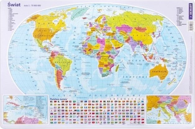 Mapa świata z podziałem politycznym jest wykonana w skali 1:70 000 000.