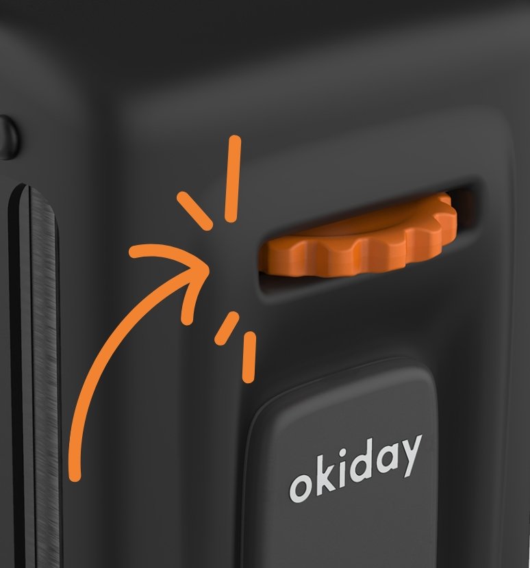 Podnóżki Okiday zostały wyposażone w mechanizm, który jest bardzo łatwy i intuicyjny w obsłudze. Używając pokrętła możesz podnieść lub opuścić podparcia podtrzymujące stopy Twojego dziecka. Kółko obraca się bardzo lekko, dzięki czemu Twoje dziecko będzie mogło samo wyregulować wysokość podparć w taki sposób, aby było mu najwygodniej.
