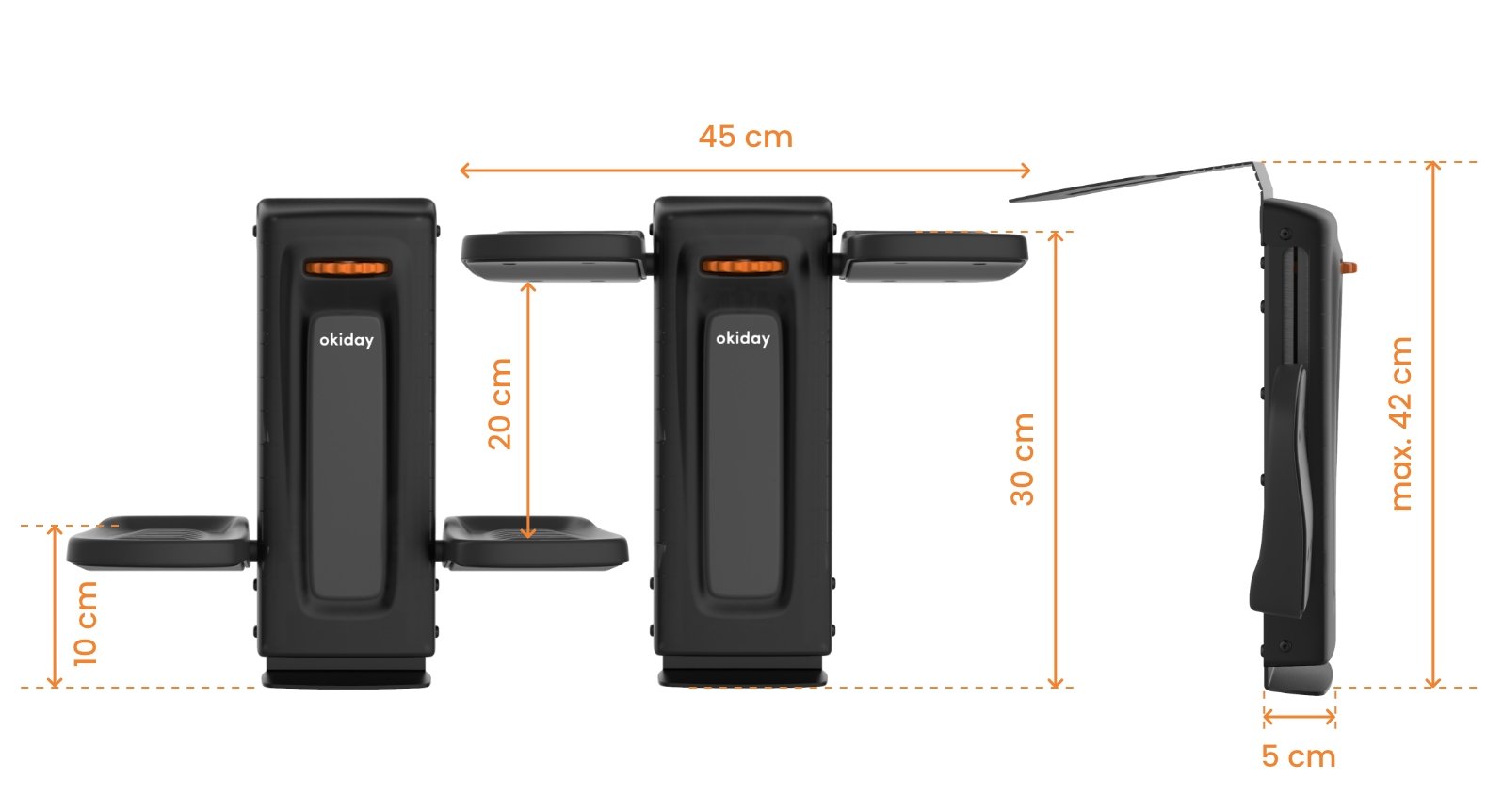 Dziecko, wsiadając do samochodu może stabilnie stanąć na podnóżku, aby zająć wygodną pozycję w foteliku. Na podnóżkach OKIDAY dzieci mogą stawać. Konstrukcja Stópołapek wykonana jest ze stopów lekkich metali i żadne dziecko nie będzie w stanie ich zniszczyć. Stópołapki mają bowiem solidny zapas „mocy”