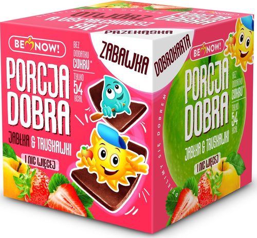Kostka z niespodzianką jest najlepszą odpowiedzią na potrzeby dziecka. Łączy w sobie zdrowy smakołyk, zabawkę i dobrokartę - zestaw, któremu nie da się oprzeć! Kostka zawiera zdrowy smakołyk – jabłkowo-truskawkowy listek, słodki batonik zrobiony w 100% z owoców.