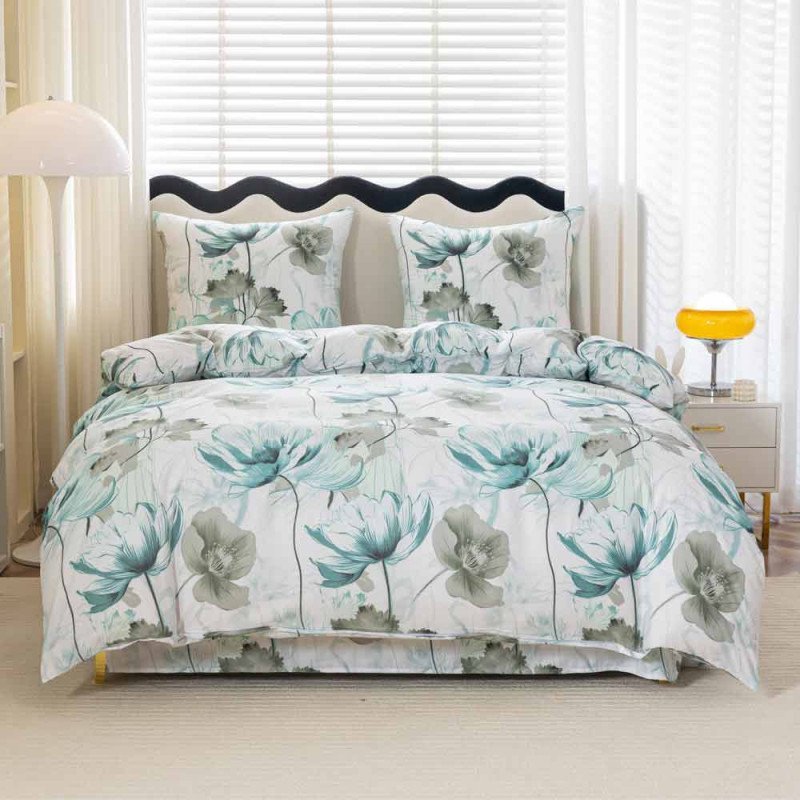 Pościel 220x200 bawełna satynowa dwustronna Cotton World gruba 3 części AML 3054 biała kwiaty szaro-niebieskie
