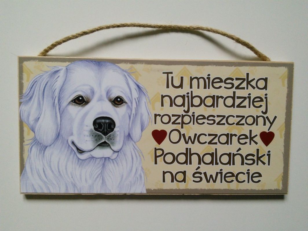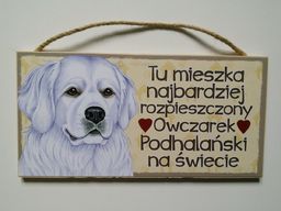 Drewniana tabliczka dekoracyjna z motywem i napisem "Tu mieszka najbardziej rozpieszczony Owczarek Podhalański na świecie".