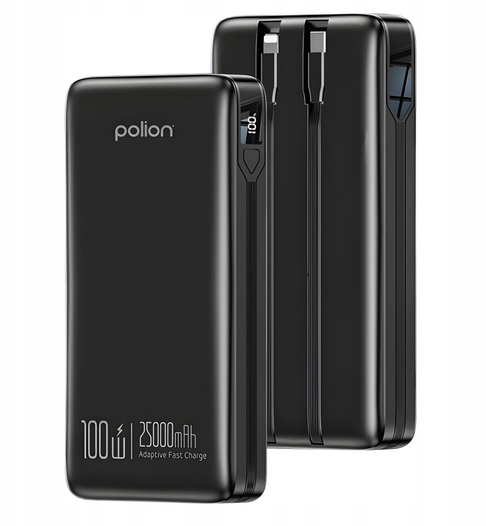 Kompaktowy powerbank POLION PLNPB007 to niezastąpione źródło energii kiedy jest najbardziej potrzebna. Wyposażony w pojemne ogniwa najwyższej jakości cechuje się bezpieczeństwem oraz pojemnością na poziomie 25000mAh. Dzięki zaawansowanej technologii oraz dostępnym dwóm złączom USB-C, jednemu USB-A oraz dwóm wbudowanym przewodom - USB-C oraz Lightning - powerbank pozwala na ładowanie kilku urządzeń jednocześnie. Urządzenie wspiera najpopularniejsze protokoły szybkiego ładowania takie jak: PowerDelivery 3.0, QuickCharge 3.0, Samsung AFC, PPS, Apple i wiele innych, przez co ładowanie odbywa się niezwykle szybko szczególnie w momentach kiedy jest to najbardziej potrzebne.