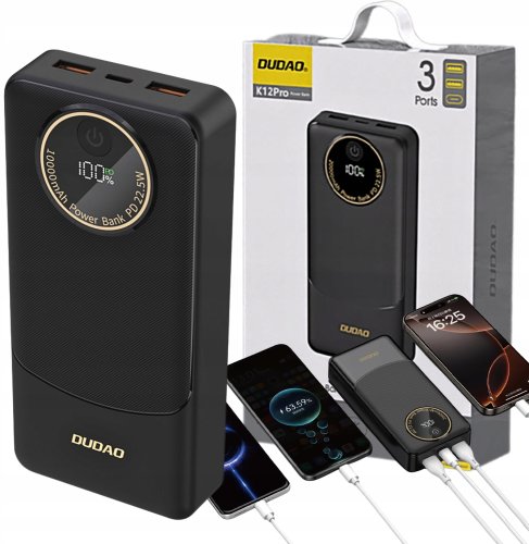 Powerbank jest wyposażony w dwa porty USB-A oraz jeden port USB-C, co umożliwia jednoczesne ładowanie do trzech urządzeń. Niezależnie od tego, czy potrzebujesz naładować telefon, tablet czy inne urządzenie, Dudao K12Pro sprosta Twoim oczekiwaniom.
