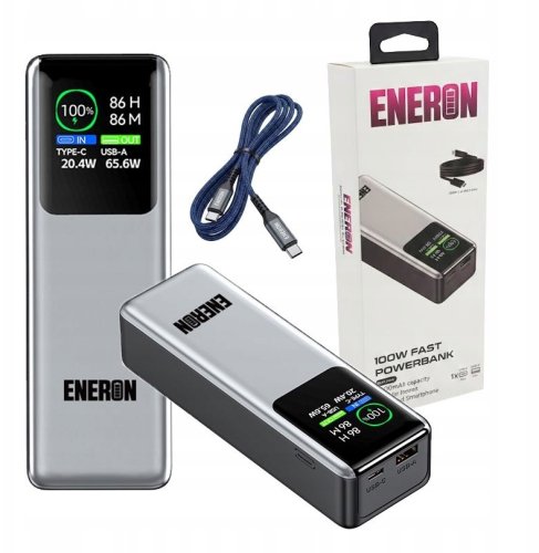 Powerbank Eneron o pojemności 20000 mAh i mocy 100 W to nowoczesne urządzenie, które zapewnia niezawodne źródło zasilania dla laptopów i telefonów w podróży. Dzięki dużej pojemności, użytkownicy mogą wielokrotnie ładować swoje urządzenia, co czyni go idealnym rozwiązaniem dla osób często podróżujących lub pracujących w terenie.
