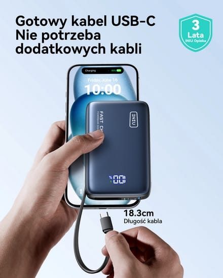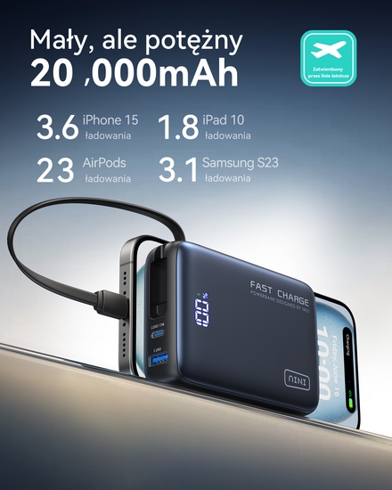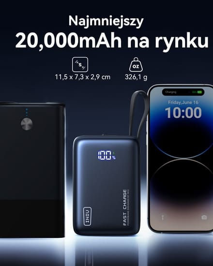 Najmniejszy na rynku powerbank o pojemności 20 000 mAh z wbudowanym kablem USB-C, zapewniający wygodne ładowanie w podróży. Jedno pełne naładowanie wystarcza, aby naładować Twój telefon aż 4 razy.