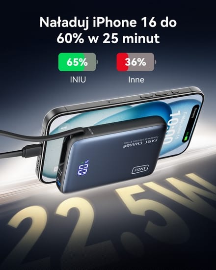 Dzięki maksymalnej mocy ładowania PD 22,5W ten powerbank naładuje Twój iPhone 16 do 60% w zaledwie 25 minut — 2 razy szybciej niż standardowe powerbanki o mocy 12W. Niezbędny dla podróżników i miłośników aktywności na świeżym powietrzu — pojemność 20 000 mAh umożliwia naładowanie iPhone’a 16 aż 4 razy. Naładuj raz i korzystaj przez cały tydzień!