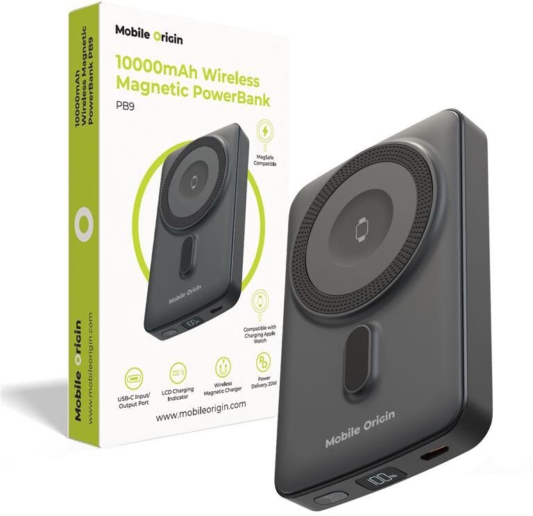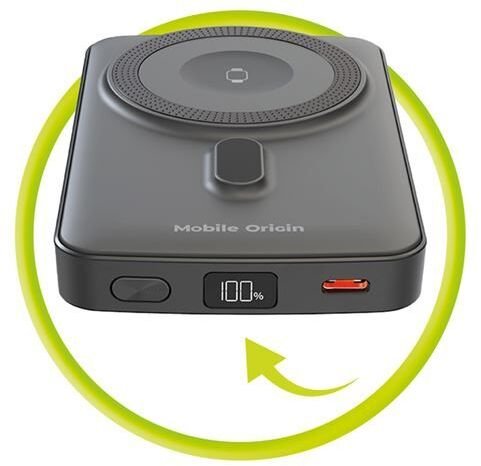 Bezprzewodowy power bank Mobile Origin o pojemności 10 000 mAh zapewnia szybkie i wygodne ładowanie zarówno telefonów, jak i zegarków dzięki obsłudze MagSafe i zintegrowanej ładowarce bezprzewodowej dla Apple Watch.