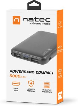 Power bank Natec Extreme Media TREVI COMPACT 5k jest uniwersalnym bankiem energii. Zastosowanie podwójnego wyjścia USB umożliwia jednoczesne ładowanie dwóch urządzeń, a złącze USB Type-C zapewnia kompatybilność z najnowszymi rozwiązaniami. Dzięki podwójnemu wejściu masz wybór jakim przewodem chcesz ładować urządzenie. Jeżeli twój sprzęt korzysta z najnowszego rozwiązania USB-C możesz wykorzystać przewód Type-C, którego używałeś dotychczas. Power bank posiada również standardowe złącze microUSB, które jest kompatybilne ze znaczną większością urządzeń dostępnych na rynku.