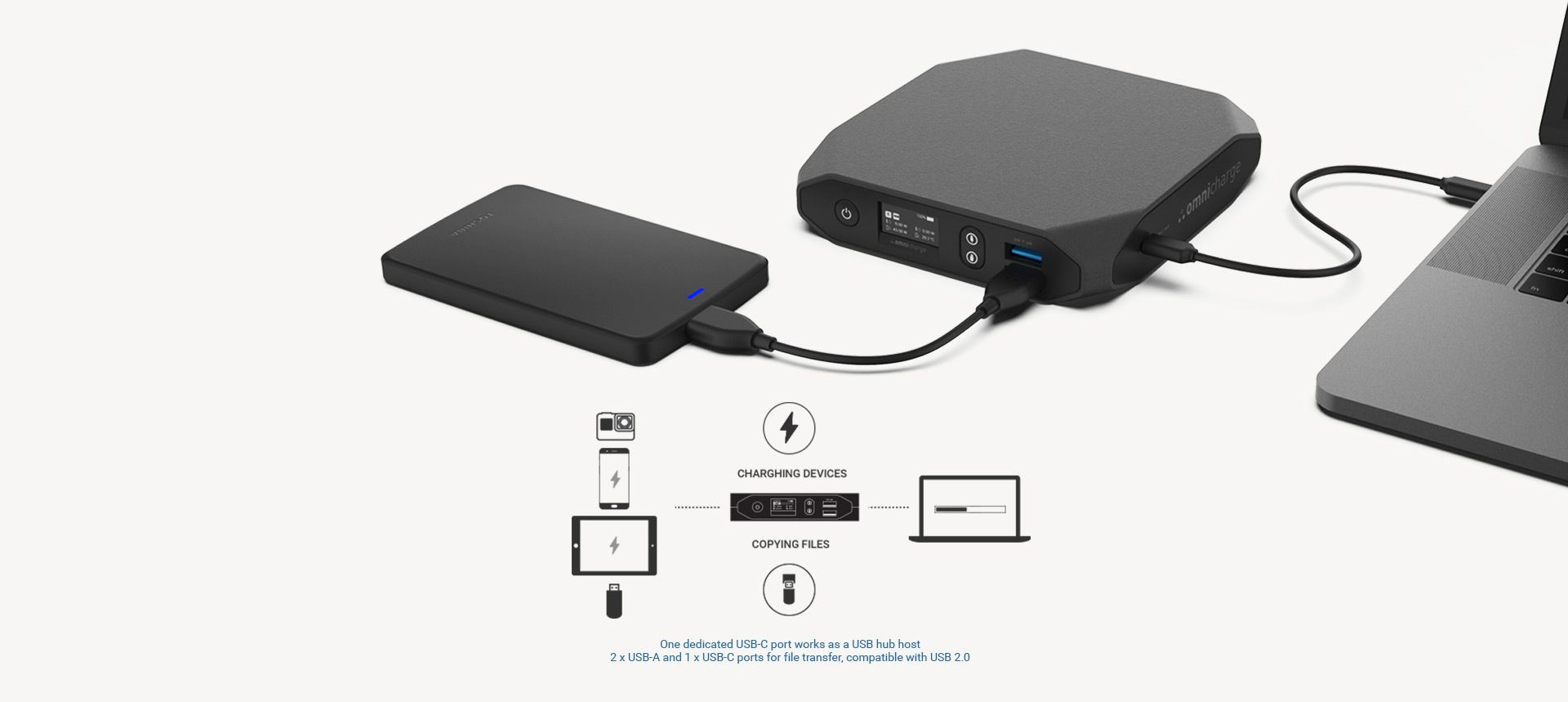 Dzięki funkcji USB HUB możesz wykorzystać swojego Omnicharge jako rozszerzenie portów swojego komputera. Zajmując tylko 1 port USB-C komputera uzyskujesz 3 porty USB, do których możesz podłączyć inne urządzenia i wymieniać między nimi pliki. Po prostu podłącz OMNI 20 USB-C do portu USB-C swojego komputera, a następnie podłącz 1, 2 lub 3 inne urządzenia do dwóch gniazd USB-A i drugiego gniazda USB-C w swoim OMNICHARGE.