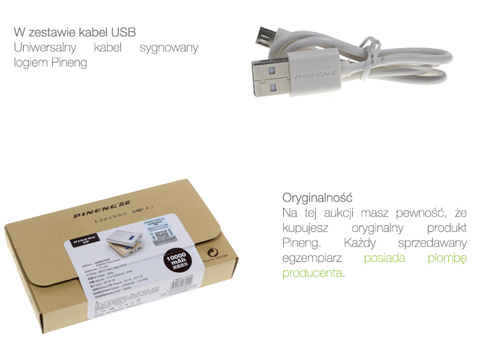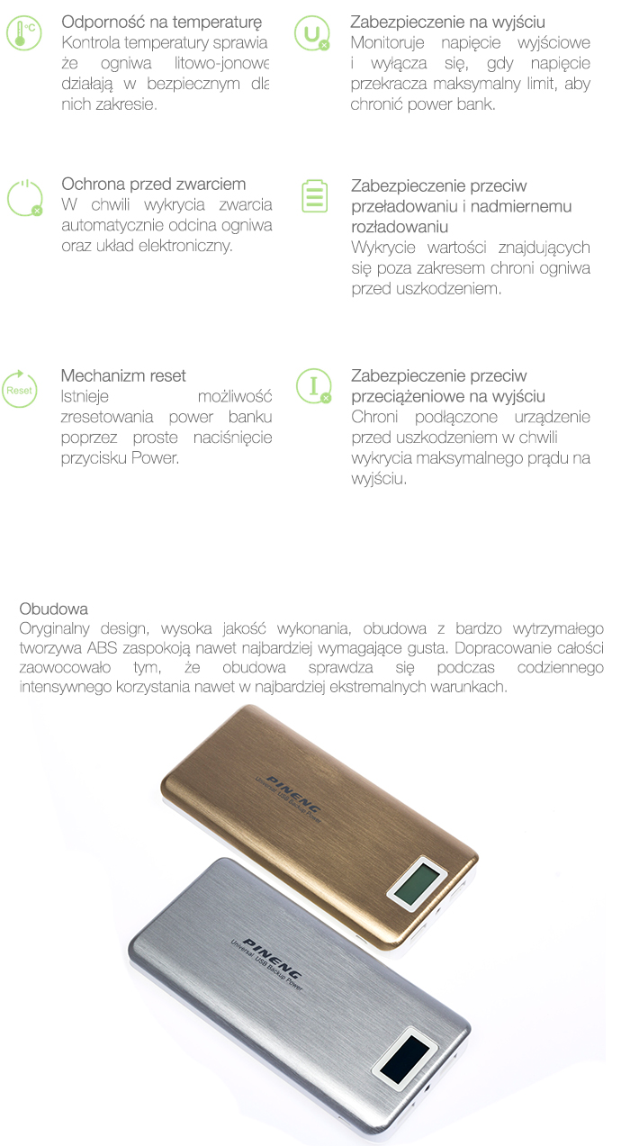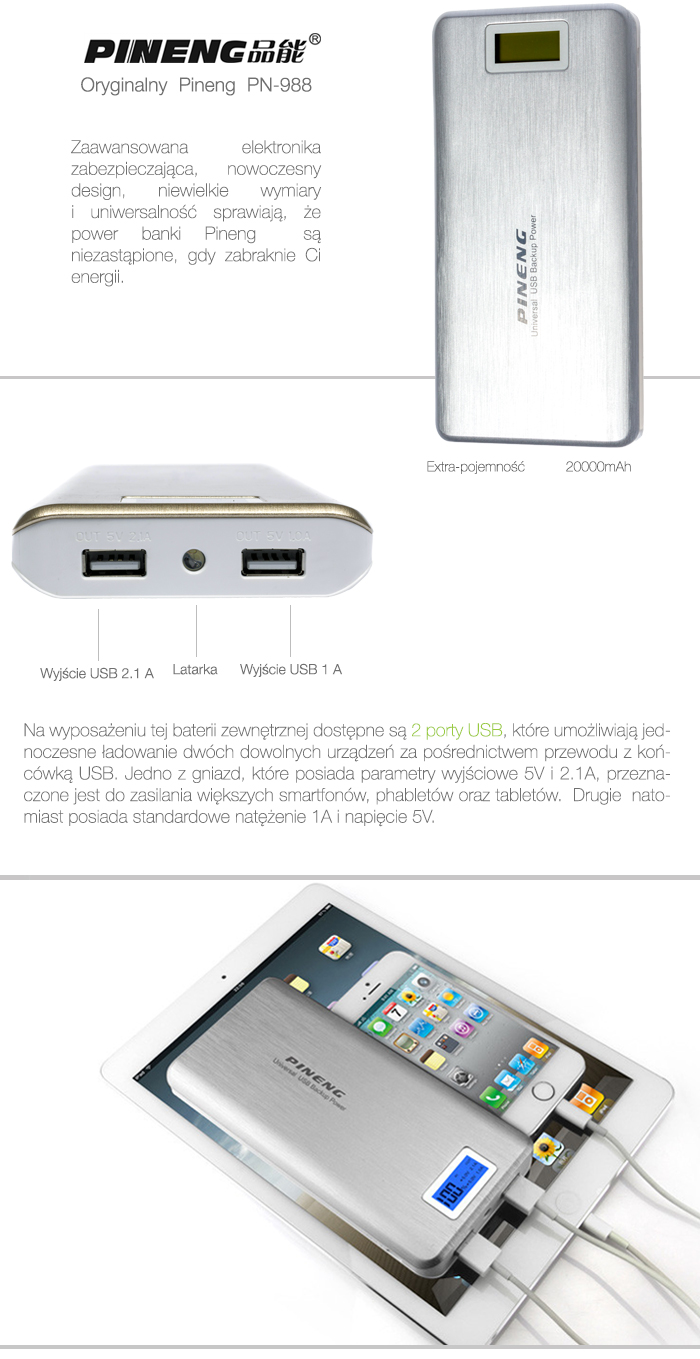 Power bank PN 999 marki Pening opiera swoje działanie na ogniwach litowo-jonowych o łącznej realnej pojemności 20000mAh. Na wyposażeniu przenośnej ładowarki znajduje się również wyświetlacz LCD, który prezentuje w procentach ilość zgromadzonej energii oraz parametry napięcia i natężenia zarówno na wejściu jak i wyjściu. Duża pojemność akumulatora umożliwiła inżynierom na wprowadzenie diody LED, która służy jako latarka. Gadżet ten przydaje się w chwili kiedy jesteśmy np. pod namiotem lub gdy potrzebujemy oświetlić sobie drogę.