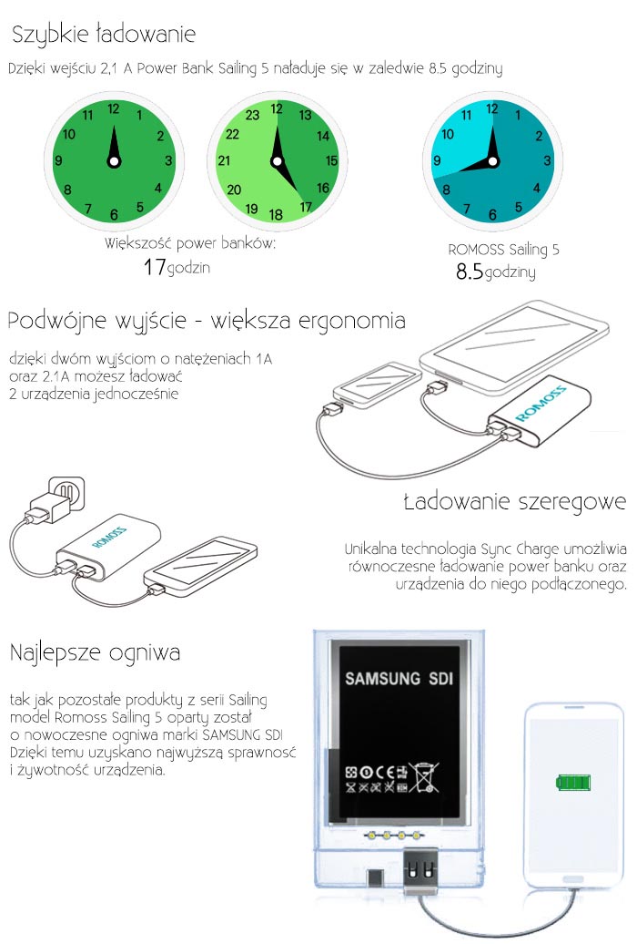 Przenośny magazyn energii jakim jest Sailing 5 do działania wykorzystuje niezwykle wydajne ogniwa marki Samsung, które zapewniają stabilne i niezawodne funkcjonowanie. We wnętrzu urządzenia znajdują się również inteligentne układy elektroniczne, które są odpowiedzialne za zabezpieczenia oraz szybkie ładowanie akumulatorów. Inżynierowie konstruujący obudowę, umieścili na niej wskaźniki naładowania akumulatora, 2 porty USB oraz 1 port microUSB. Wskaźnik zgromadzonej energii umożliwia nam bieżące sprawdzanie pojemności naładowania ogniw akumulatora, podwójny port USB umożliwia jednoczesne dostarczanie energii do dwóch produktów, port microUSB pozwala na ładowanie samego power banka. Przenośna ładowarka Romoss Sailing 5 wyposażona jest również w elektroniczny system umożliwiający jednoczesne ładowanie banku energii jak i podłączonych do niego urządzeń przenośnych.