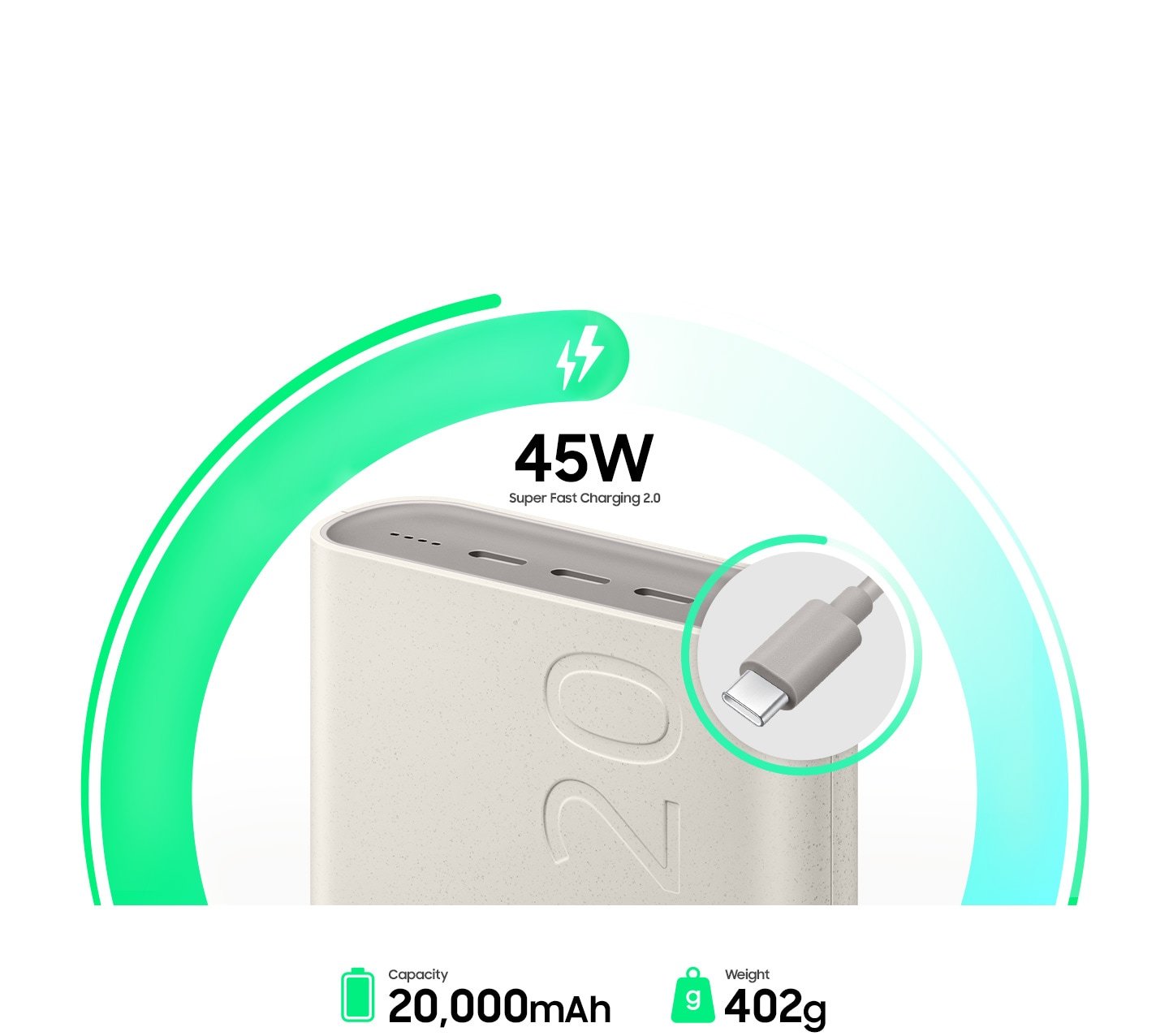 Powerbank 45 W o dużej pojemności 20 000 mAh jest wyposażony w superszybkie ładowanie przewodowe, które umożliwia szybkie ładowanie maksymalnie 3 urządzeń jednocześnie, a także samego powerbanku, zapewniając prędkość i moc, gdy jej potrzebujesz.