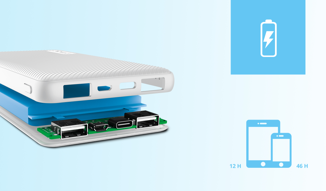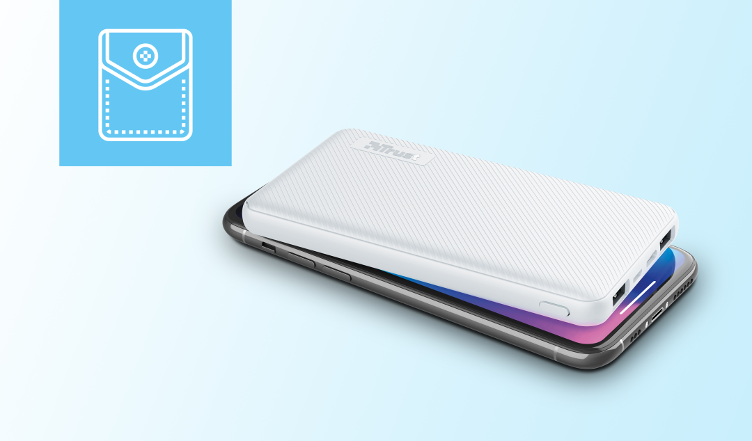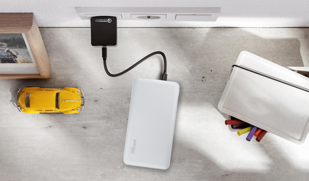 Trust Primo Powerbank 10.000 mAh jest szybki i inteligentny. Automatycznie dostarcza maksymalną moc do Twoich urządzeń. Możesz także szybko naładować powerbank za pomocą dołączonego kabla micro-USB lub przez port USB-C. Inteligentny wskaźnik poziomu LED na powerbanku informuje o aktualnym stanie naładowania powerbanka.