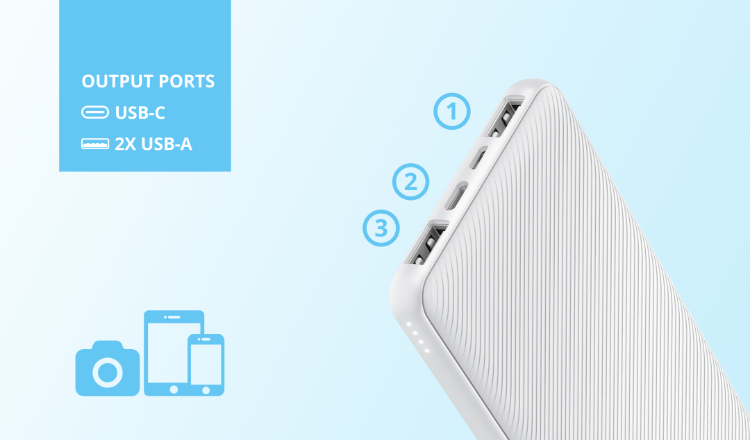 Dzięki 2 portom USB-A i 1 portowi USB-C możesz ładować praktycznie każde urządzenie dowolnej marki, w tym Apple i Samsung. Możesz także ładować także dwa urządzenia jednocześnie.